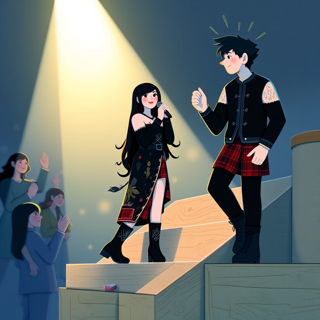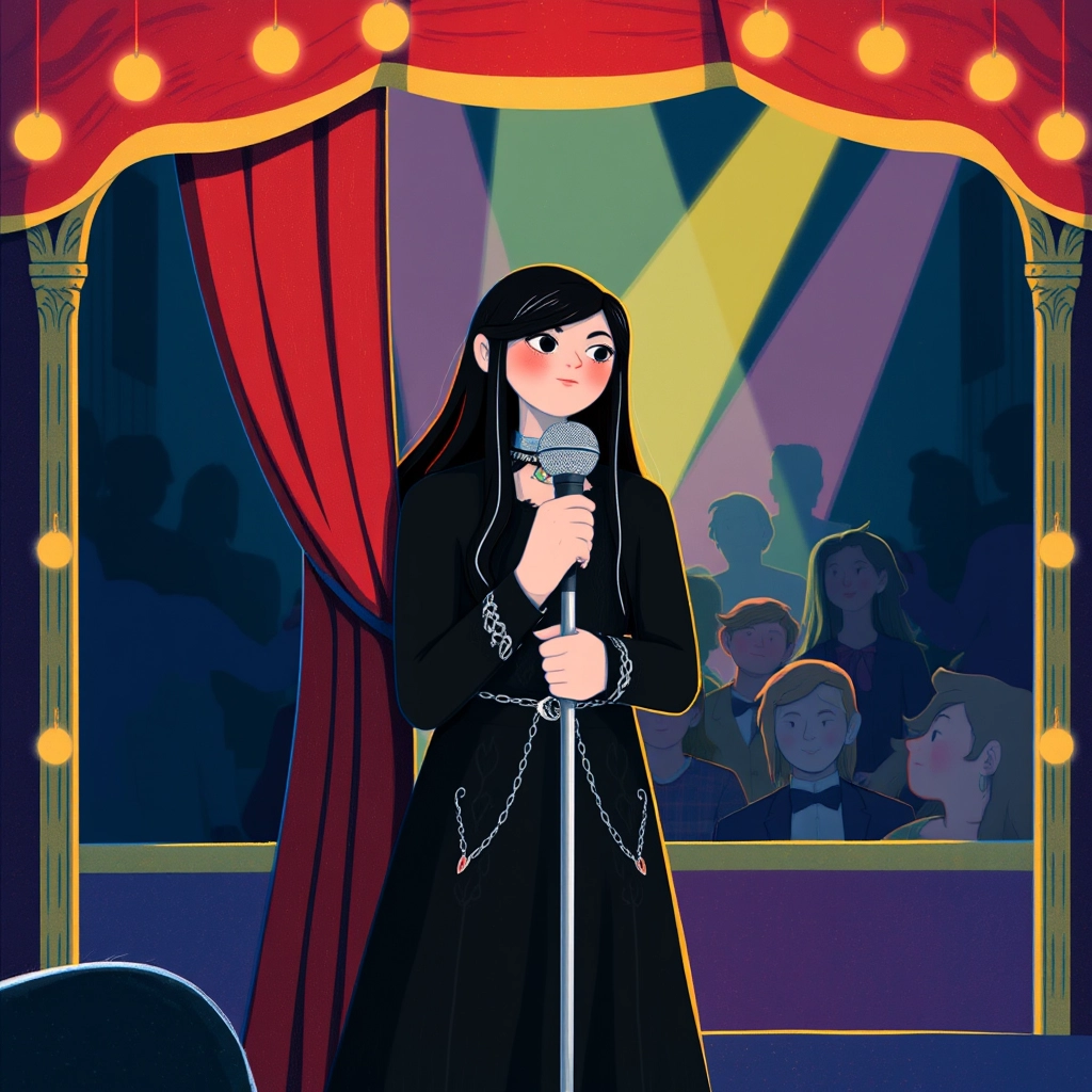 Finally, the big day came! Wearing a gothic performance outfit she designed herself—a glittering black dress with silver accents—[Tara](99H747TJ) peeked from backstage and froze as all eyes seemed to be on her.