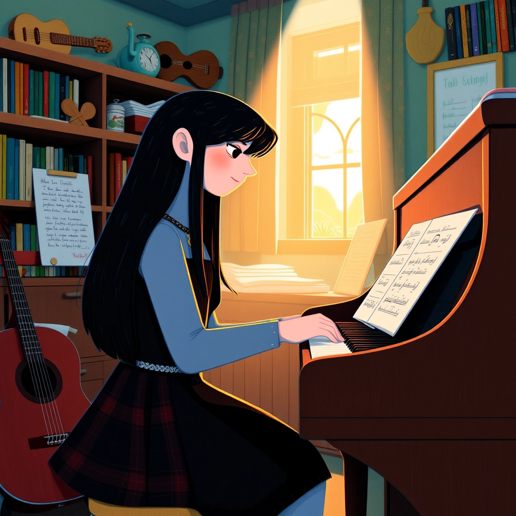 [Tara](99H747TJ) nervously signed up, but doubts crept into her mind. What if no one liked her songs? What if she tripped and fell on stage? The music room became her hideout, where she rehearsed quietly.
