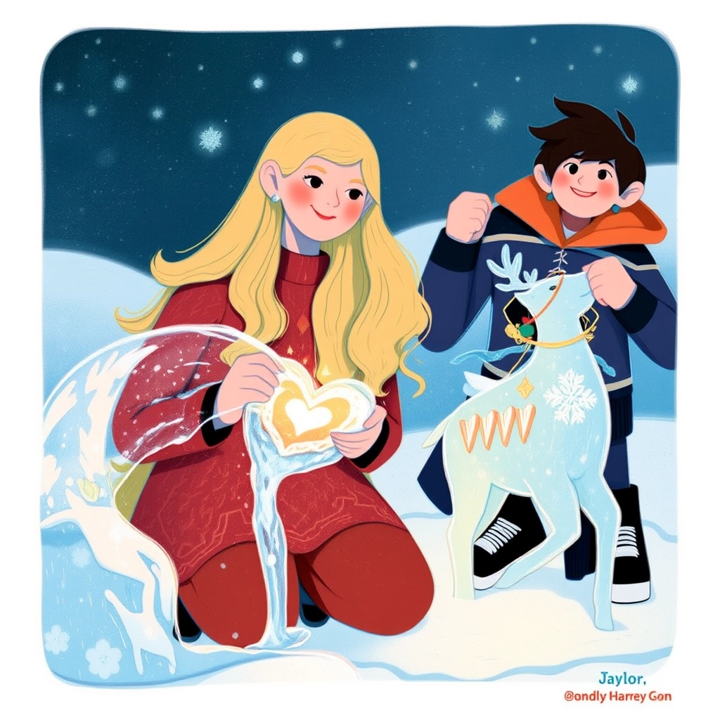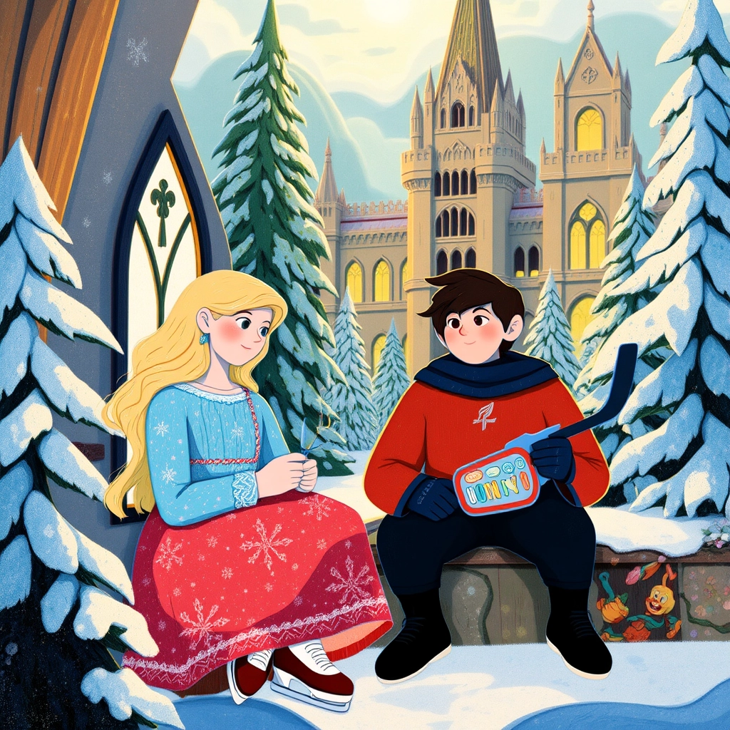 One snowy morning, [Taylor](6MTNHYH9) decided to teach [Jordan](LYVSM4VR) how to ice skate on the crystal-clear palace pond, not knowing that a magical adventure awaited them.
