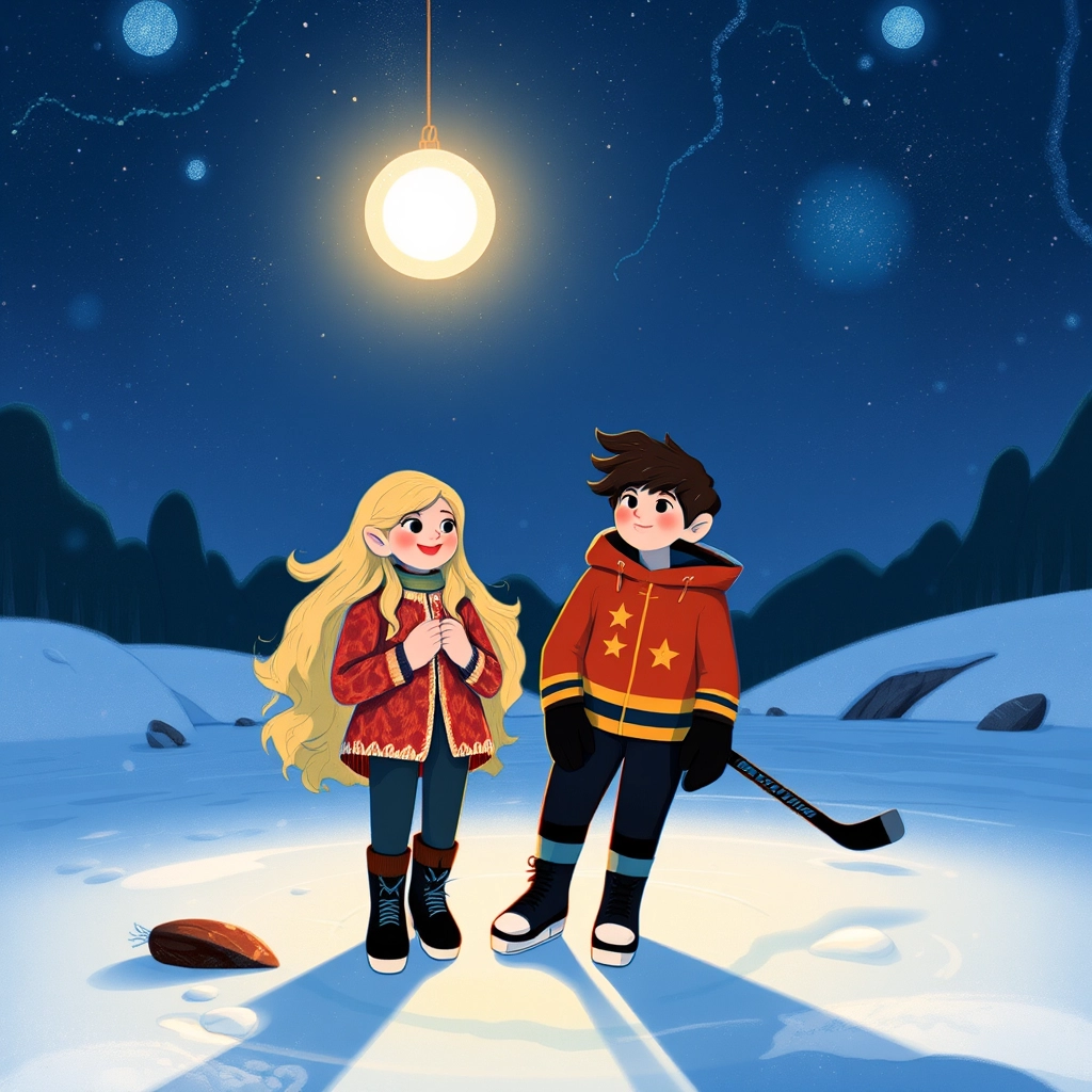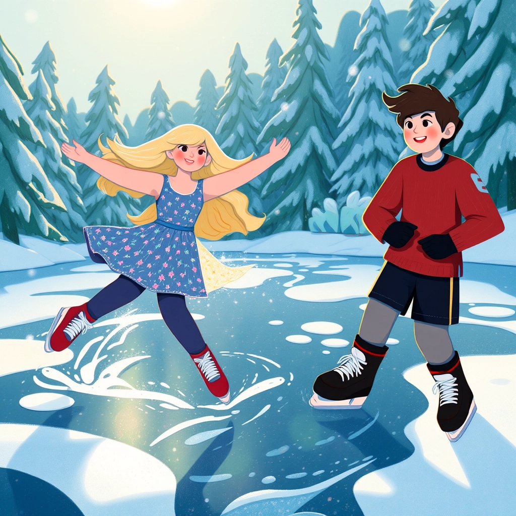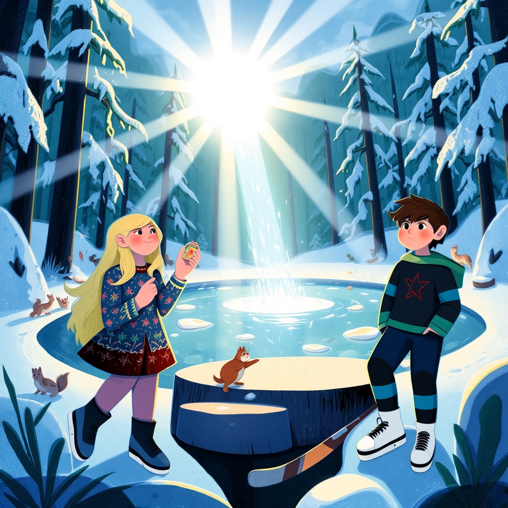 While skating, they noticed a tiny glowing orb hovering above the pond; as they got closer, it whispered, 'Help me, brave children!'