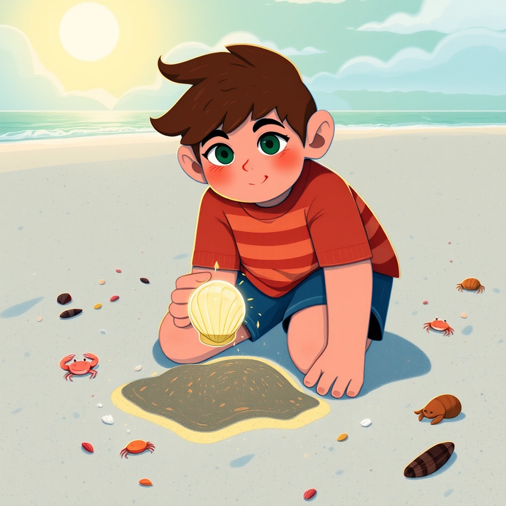 One sunny afternoon, he spotted something strange buried in the sand. It was glowing brightly!