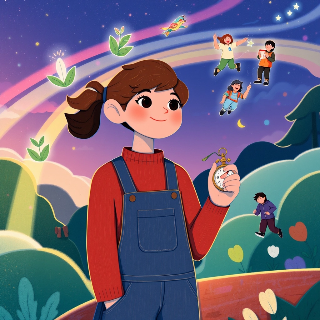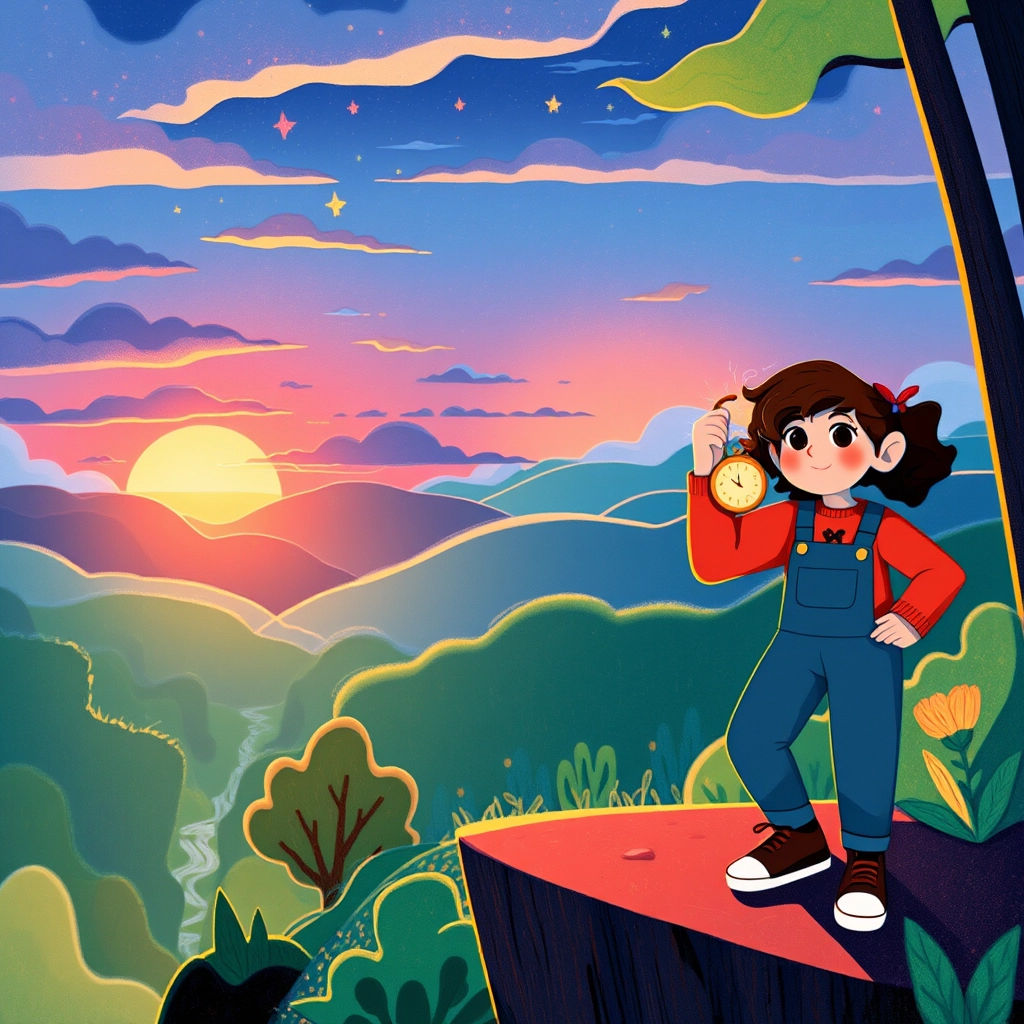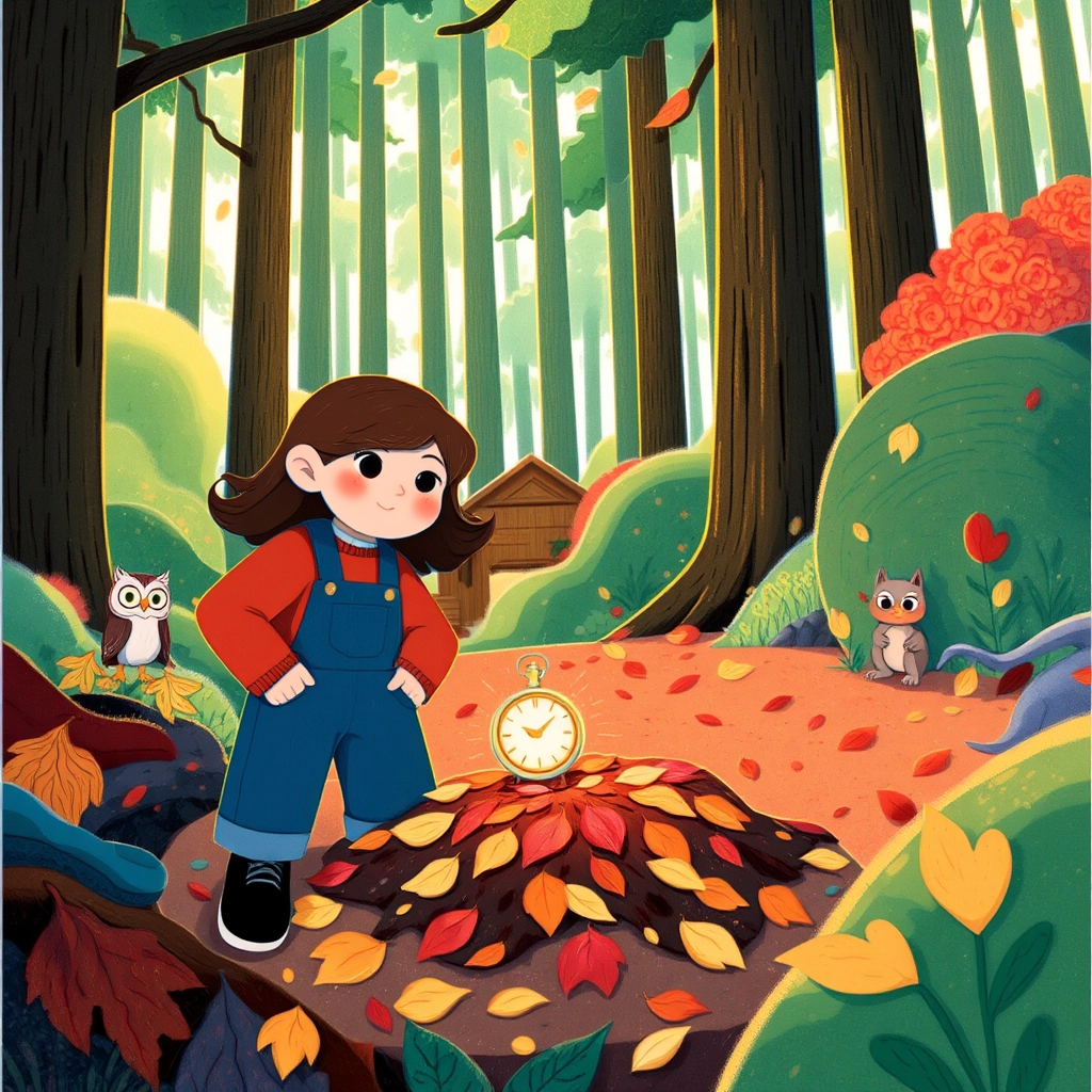 In a quiet corner of Wonder Woods, young [Mia](7Z4PNVW5) found an old golden stopwatch hidden under a pile of autumn leaves. It had strange markings and glowed faintly... something magical was happening!