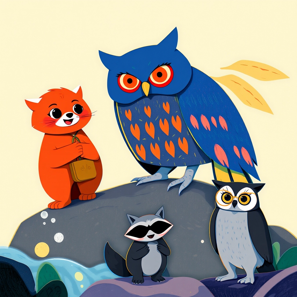 As they climbed the rocks to the waterfall’s edge, [Poppy](QS2LCYQX) and [Ricky](XKCZKC6W) discovered [Momo](LNK22VHW), a wise, blue-feathered owl who offered a clue in exchange for a story.