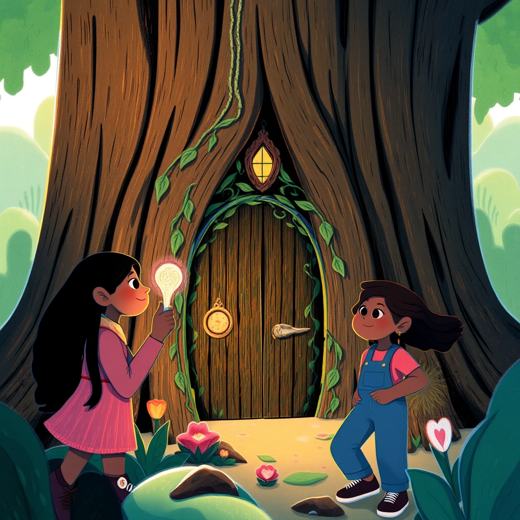 The key seemed to glow brighter as they walked further into the forest. Soon, they found a tiny, mysterious door hidden in a tree trunk.