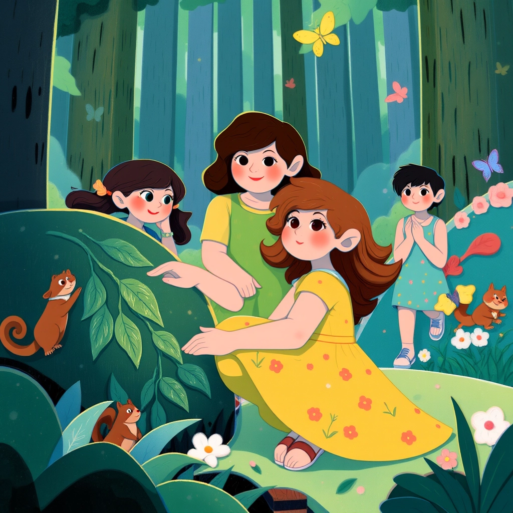 The forest trail was magical, filled with singing birds, colorful mushrooms, and rays of sunlight filtering through the leaves. The friends were excited!