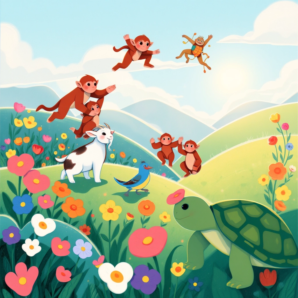 Following the clues, they reached a flower-filled meadow. A group of chattering monkeys pointed to the hills, saying [Golu](LJ2NFH75) had climbed higher.