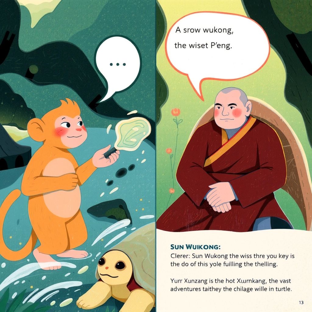 [Sun Wukong](5YDF55PT) loved to play with his friends, but he longed for adventure beyond the mountain. One day, while exploring, he met a wise turtle, Master P’eng, who spoke of a journey with the monk [Xuanzang](BBBDKLRN).