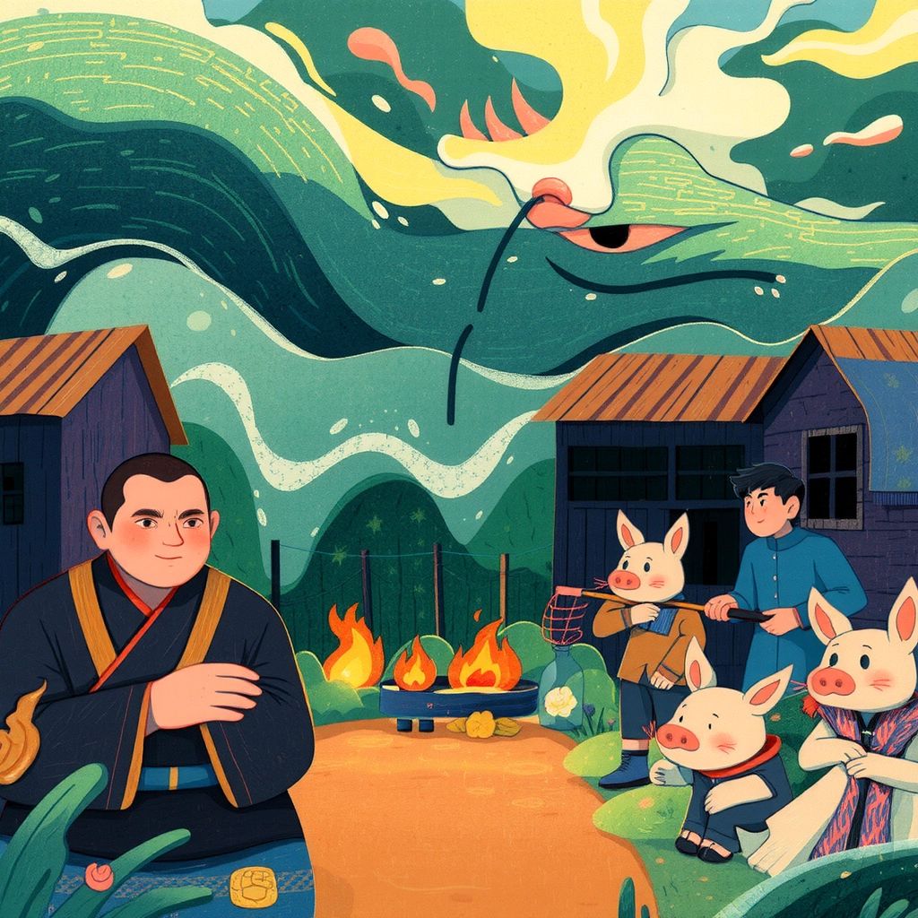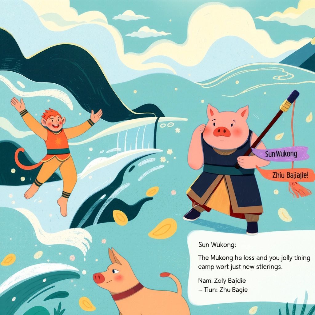 Upon reaching a river, they met [Zhu Bajie](F54MTYWM), a jolly pig needing help after getting stuck in the water. [Sun Wukong](5YDF55PT) created a cloud bridge to rescue him, and [Zhu Bajie](F54MTYWM) joined their adventure.