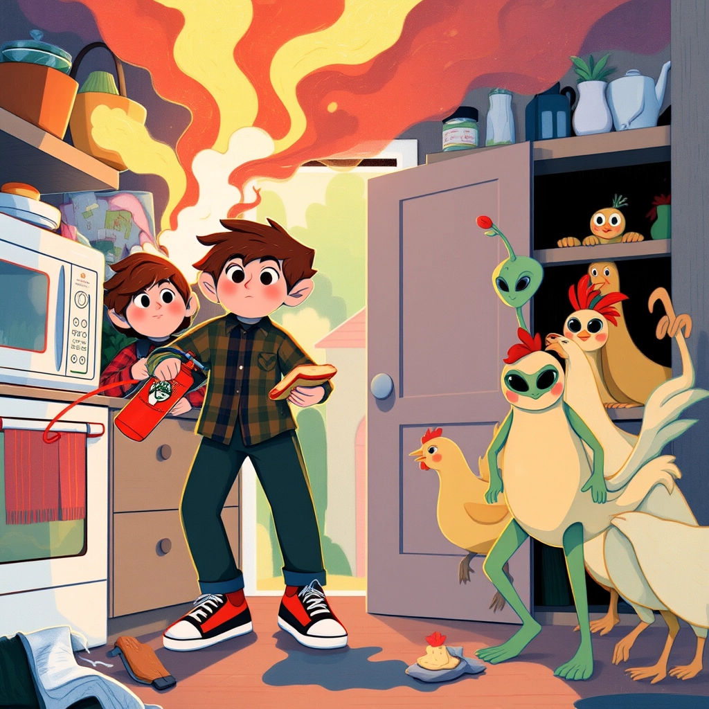 [Gorlon](F23X3YF4) gradually learned about Earth, but there were still hiccups. He accidentally set the microwave on fire, thinking it was a time-travel machine! Luckily, [Nate](KRMFPK4K) was there to explain things and clean up the mess.