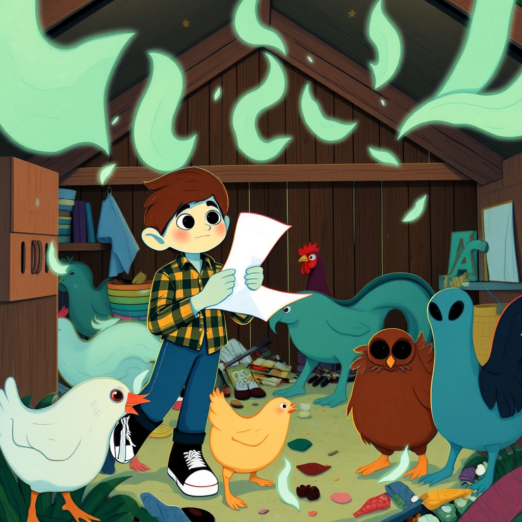 [Nate](KRMFPK4K) lived on a small farm surrounded by fields and hills, where the mornings smelled of fresh hay and chickens clucked cheerfully. One evening, while [Nate](KRMFPK4K) was reading in his room, a loud crash shattered the calm. Rushing outside, he headed straight for the chicken coop.
