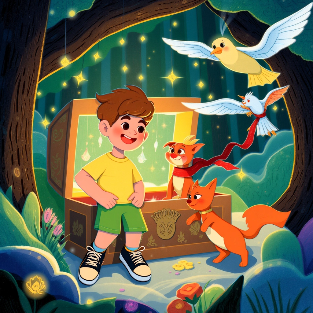 Opening the chest, they found not gold, but a magical mirror showing that their teamwork and kindness created the real treasure all along.
