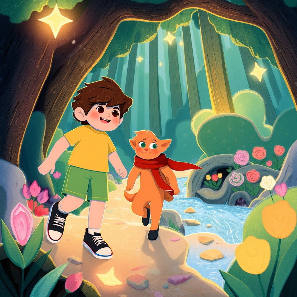 They stepped into a sparkling forest filled with giggling flowers, talking animals, and shimmering streams. [Sparky](Y3CP2SHS) dashed ahead, delighted by a glowing path!