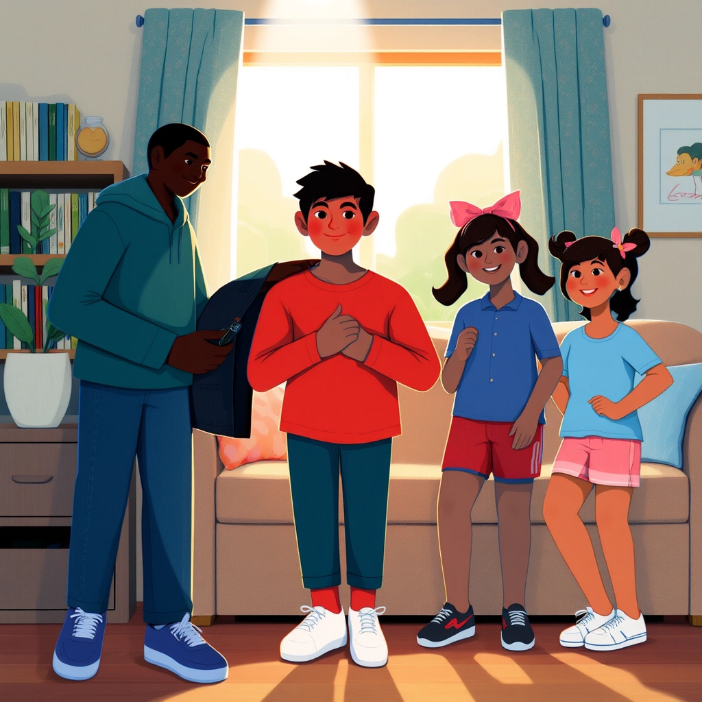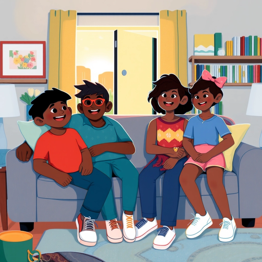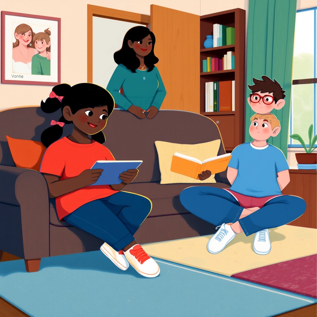 [Trinity](ZLSWZ6N3) was sitting on the couch with her pigtails bouncing as she played a game on her tablet. [Cleon](4W5Q7S2Z) was nearby, reading a book. When [Vonte](NQ94Q4GV) told them about the basement, [Trinity](ZLSWZ6N3) shook her head quickly. 'No way! The Boon Doon Man will get us!' [Cleon](4W5Q7S2Z) looked up, rubbing his glasses. 'I’ve heard about him too, but I’m not scared... much,' he added, though his voice wavered. Their mom peeked in and said, 'You’ll all do it together. It’s good teamwork!'