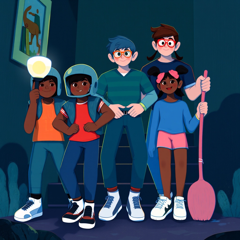 The trio dressed in their big brother’s oversized football pads and helmets, wobbling slightly because the gear was too large. [Cleon](4W5Q7S2Z) grabbed a flashlight, [Vonte](NQ94Q4GV) held a baseball bat, and [Trinity](ZLSWZ6N3) bravely carried a broom. They looked at the dark basement stairs. [Vonte](NQ94Q4GV) took a deep breath. 'Okay, let’s do this. Together!'