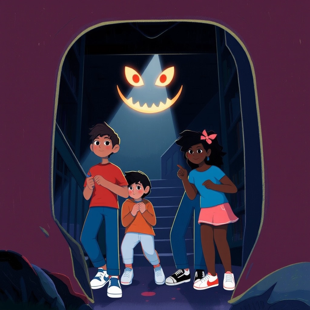 The kids slowly crept down the stairs, every creak of the steps making them jump. It was so dark they could barely see. Every shadow seemed to flicker and move. Suddenly, they heard a low, rumbling growl echo through the basement! 'What’s that?' [Trinity](ZLSWZ6N3) whispered, her voice trembling.
