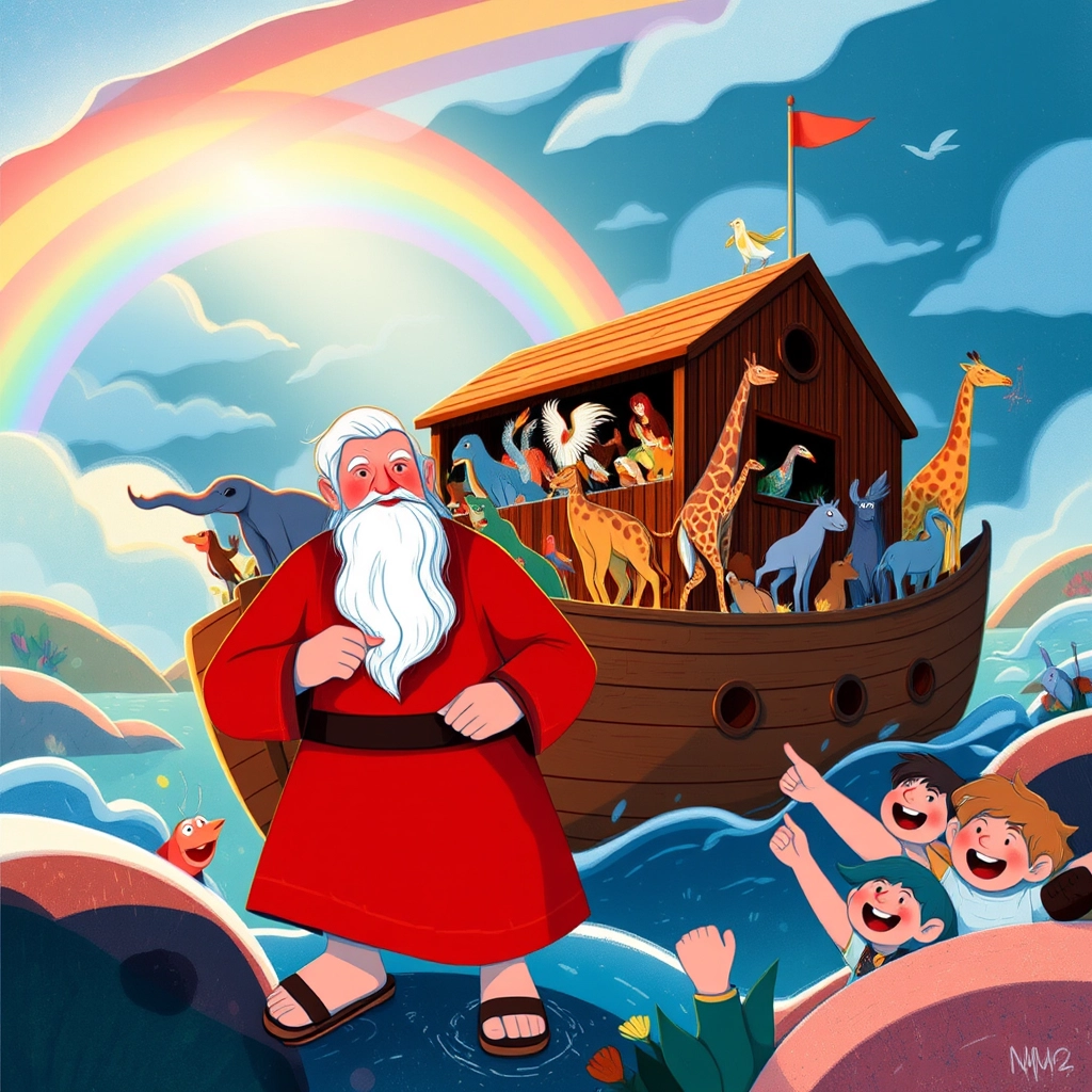 [Noah](3MMJR97Q)’s Ark was filled with animals, big and small, as the rains began to pour. But when the sun came out, a rainbow stretched across the sky – God’s promise of love and protection for all!