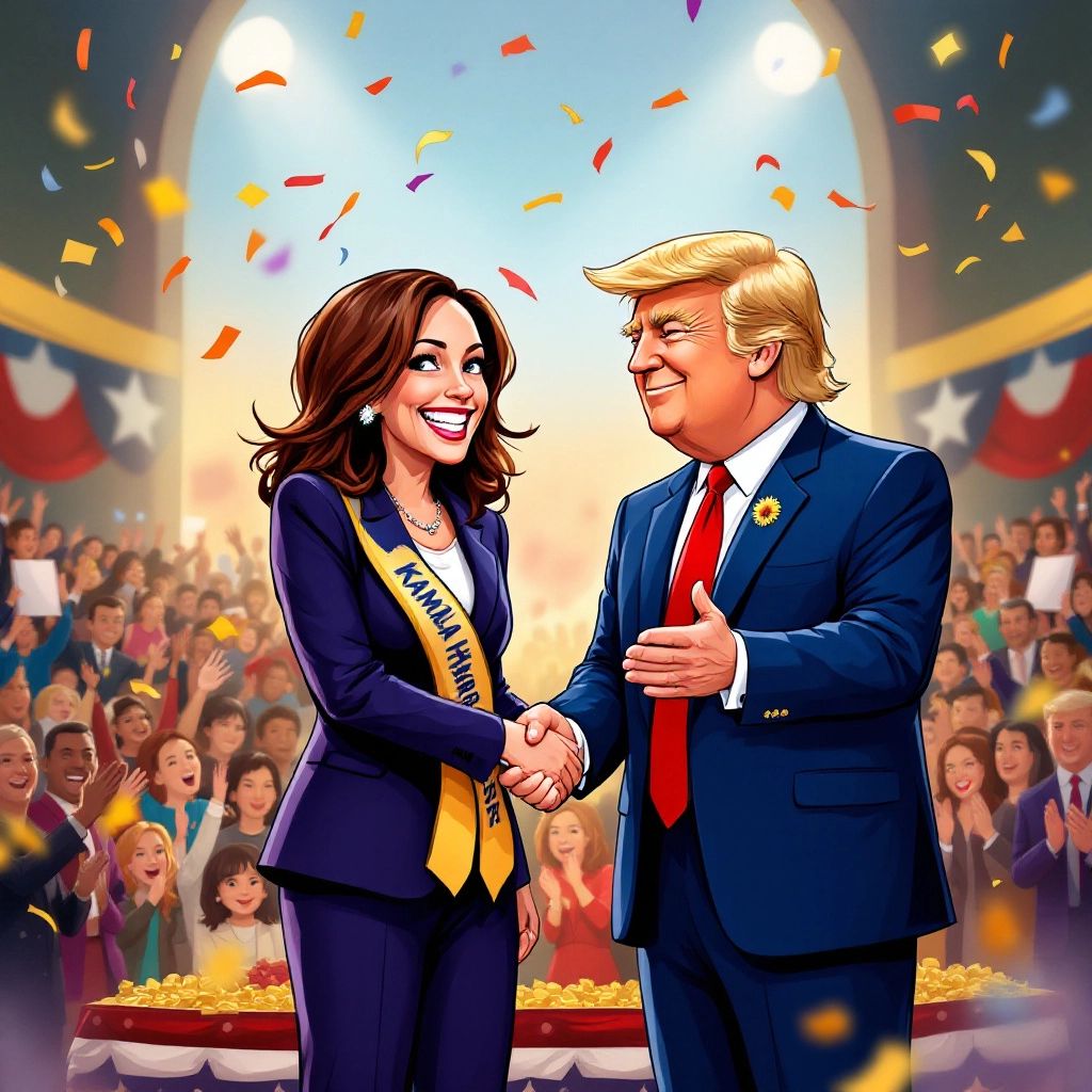 Finally, the big announcement was made! [Kamala Harris](JTWQFNMJ) won the election by just a few more votes. She promised to work hard for everyone and thanked [Trump](DP2PY6XM) for a spirited campaign.