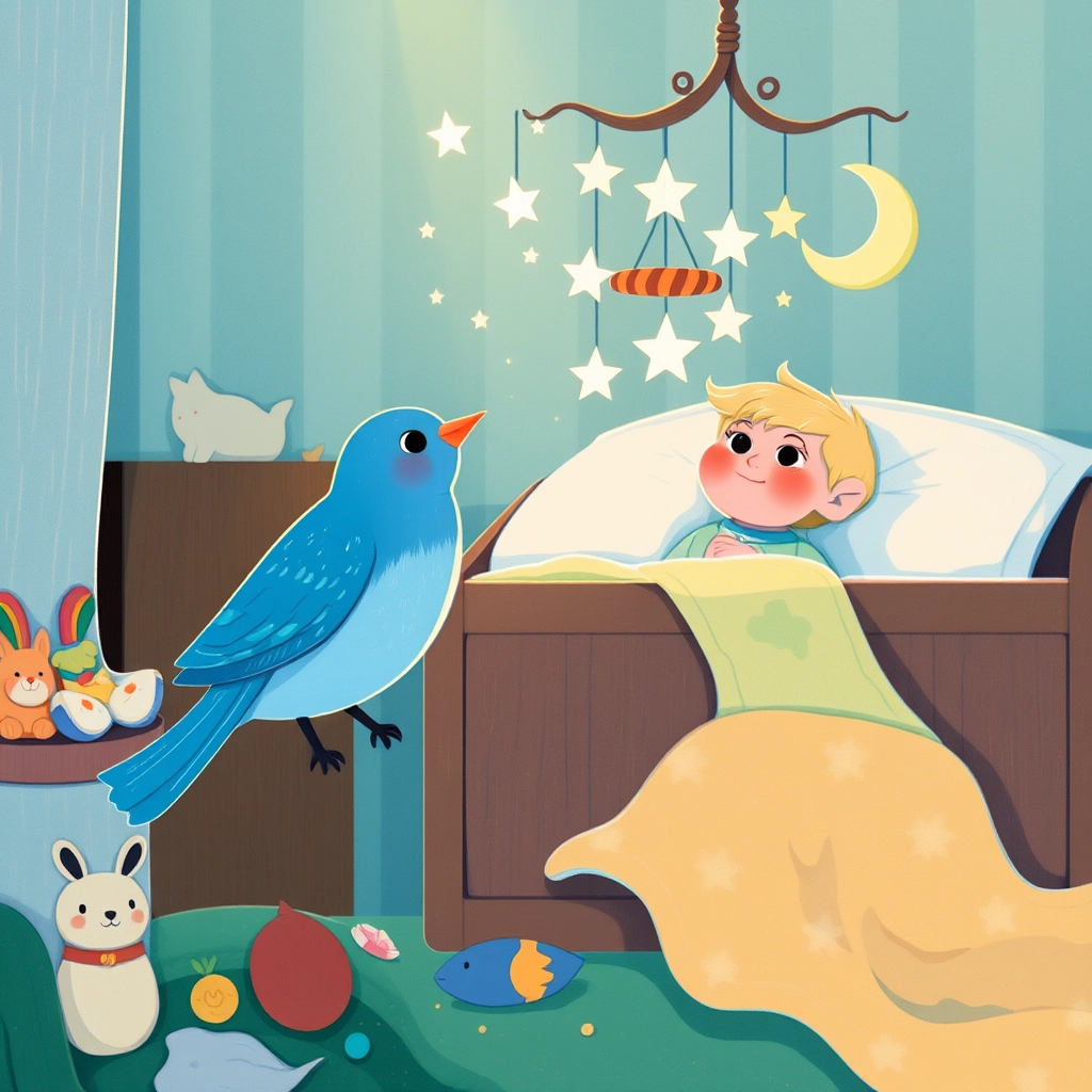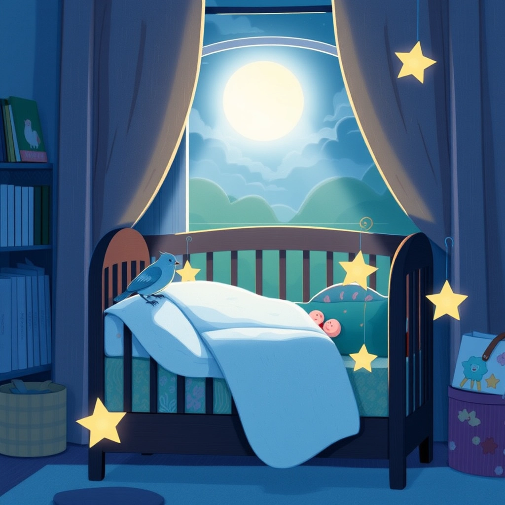 Once, in a cozy nursery bathed in moonlight, a little bluebird came to visit. The tiny baby lay quietly in the crib, staring up at the curious guest with wide, wondering eyes.