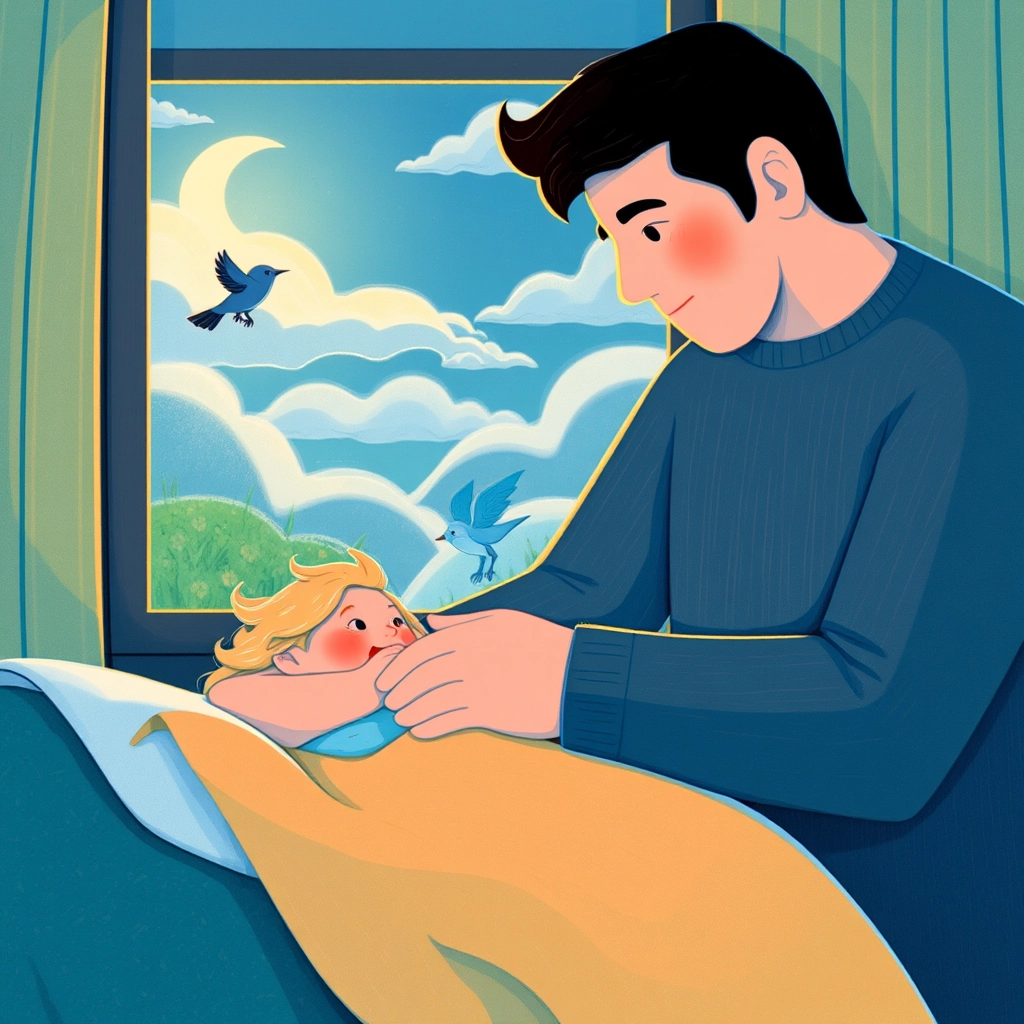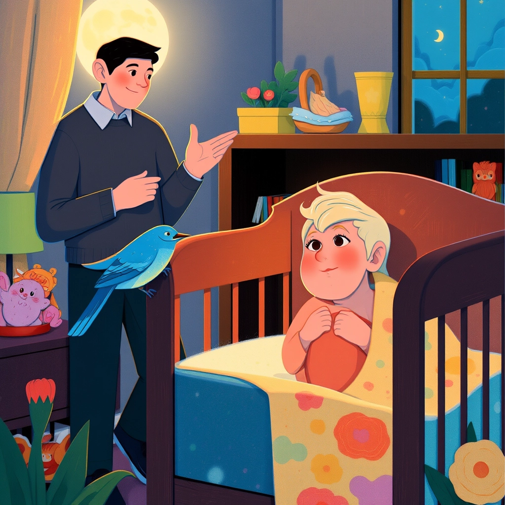 The father softly smiled, knowing the bluebird’s visits were special. 'It’s a beautiful gift to always dream big,' he whispered, tucking the baby in.