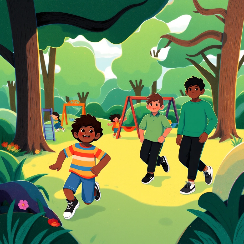 One weekend, the boys went to their neighborhood park to play. The park was alive with the laughter of other children, the rustling of the trees, and bright sunshine. [McBride](HQDC3MQK) and [Jamal](RCNKC42N) had their favorite spot near the swings where they loved to play tag and talk.