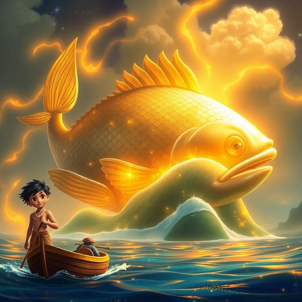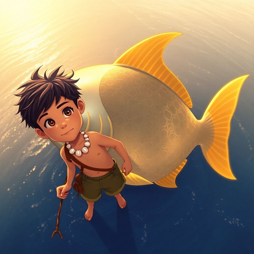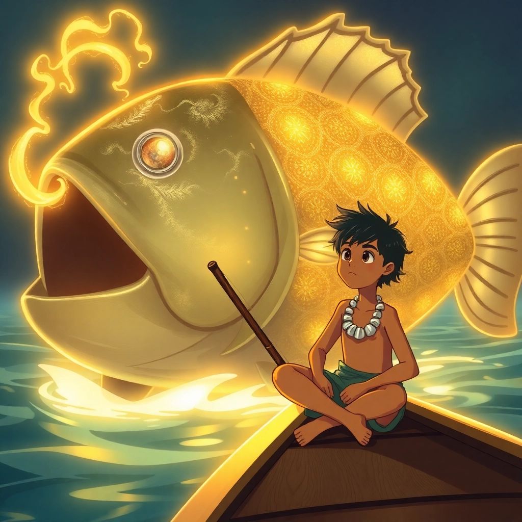 After a long, exhausting struggle, [Kahu](HHT2ZJZD) pulled the enormous fish to the surface. It was no ordinary fish—it had shining scales, mysterious patterns, and wise, gleaming eyes that seemed to tell ancient stories.