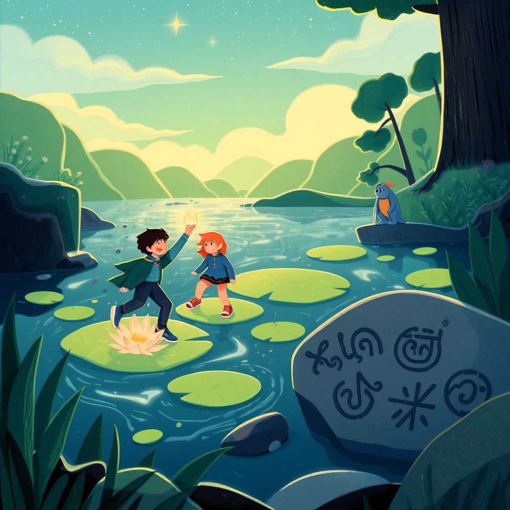 At the Whispering River, they found a stone with strange carvings. Fenwick explained, 'The river speaks if you're ready to listen.' The children worked together, listening to the bubbling water, and soon they heard faint words guiding them to cross the river using floating lily pads.