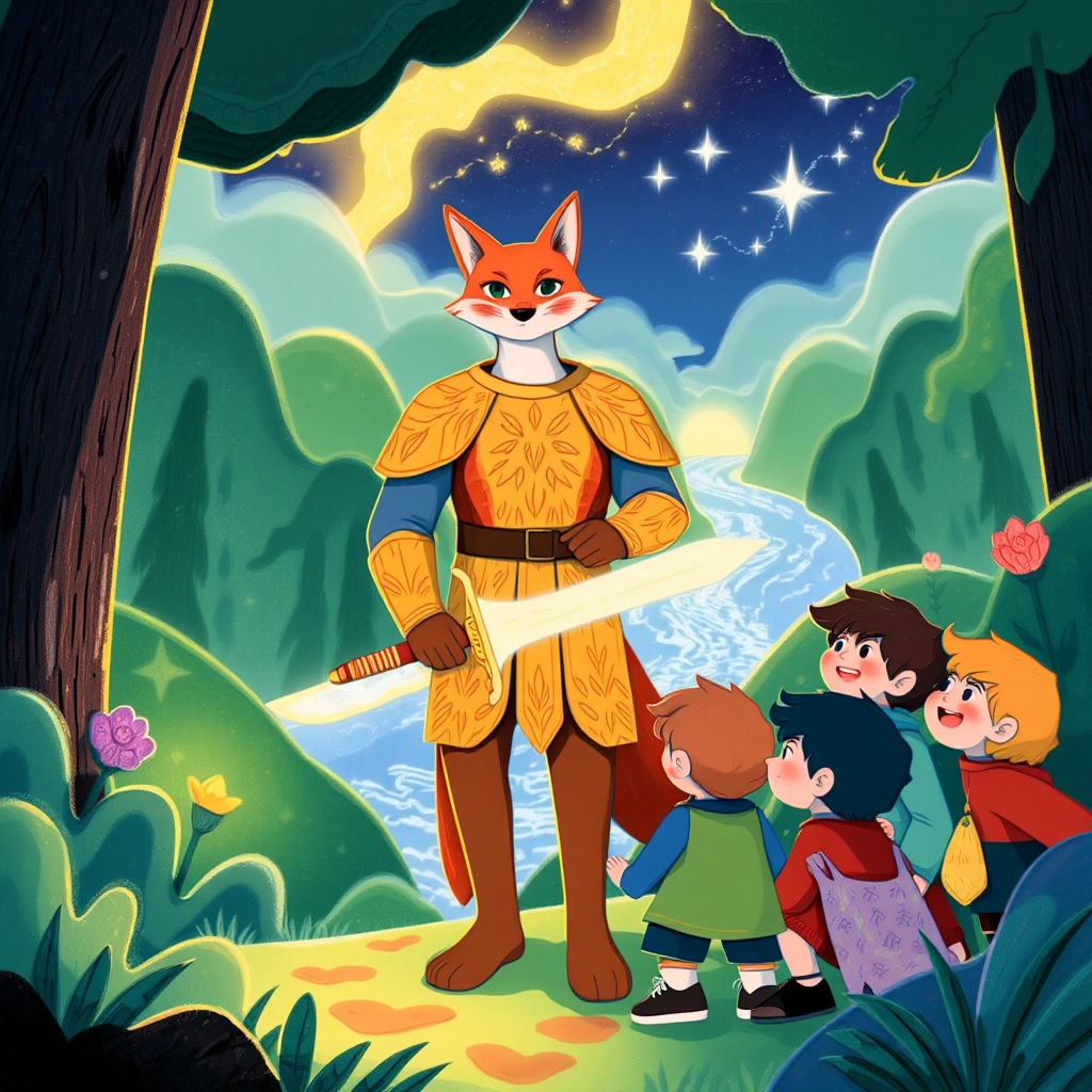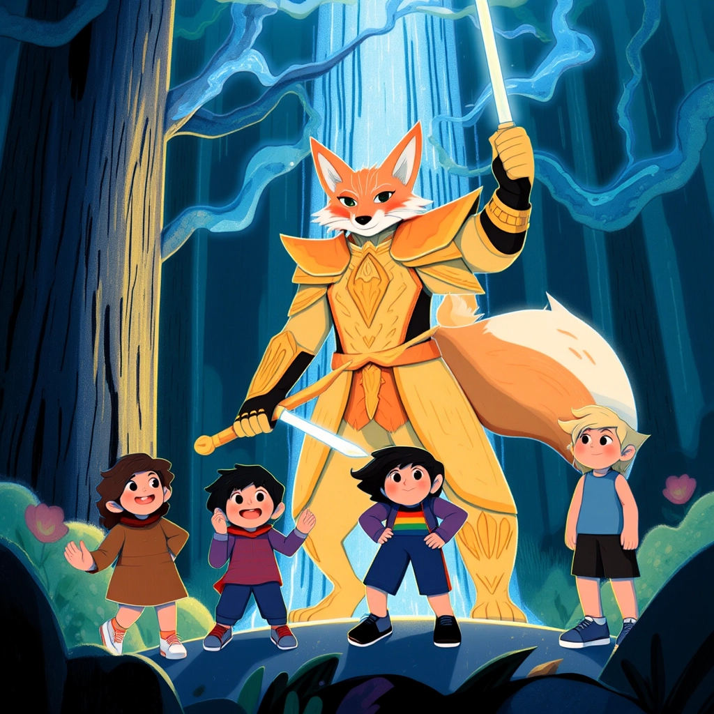 Suddenly, the ground shook, and a booming voice said, 'Who dares enter my forest?' From behind a massive, glowing tree stepped their challenge: the 'mighty hero!' But to their surprise, it was not a scary monster. Instead, it was a tall, kind-eyed fox dressed in golden armor with a glowing sword.