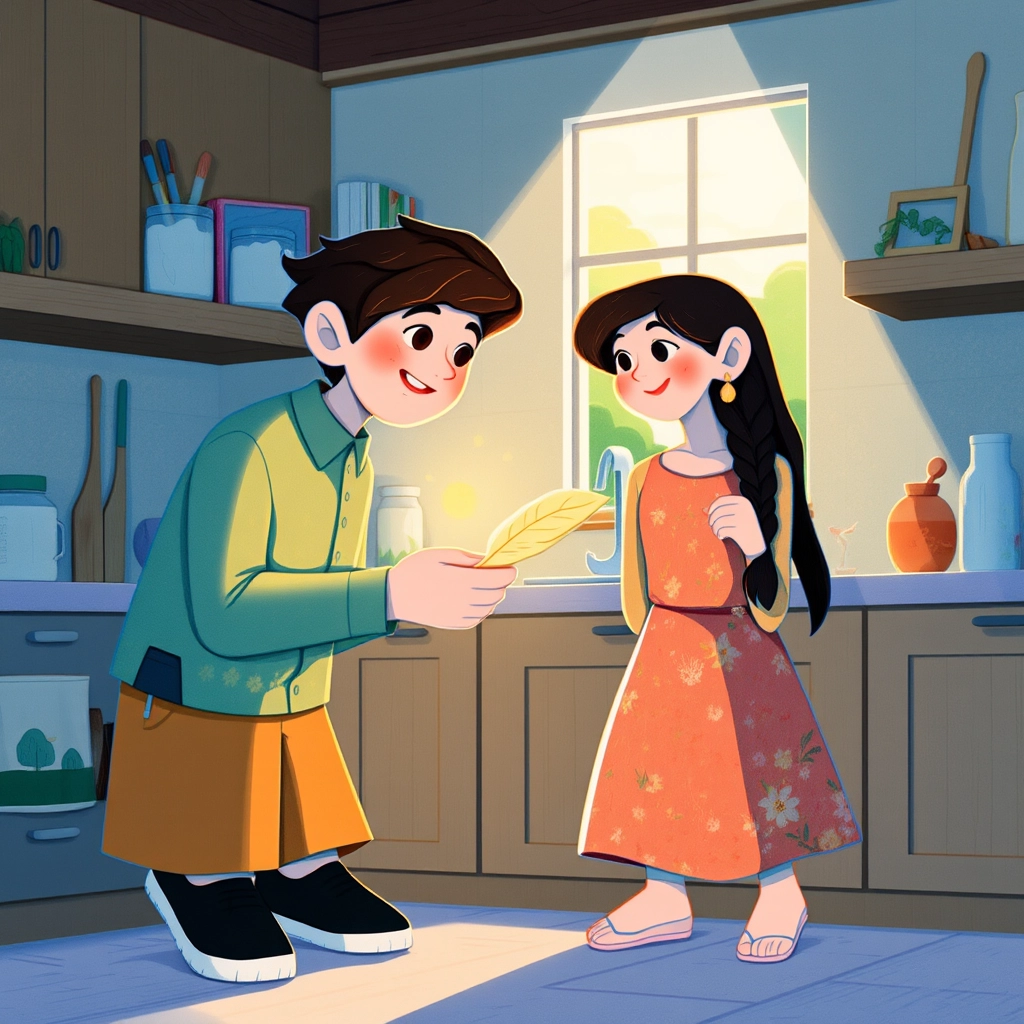 One day, [Jamie](SWCRNPF6) found a golden feather outside their doorstep. 'What is this?' he asked with wonder in his voice. [Mia](GWWYDYCH) smiled and said, 'That, my sweet [Jamie](SWCRNPF6), is the Feather of Courage. It reminds us to be brave.'