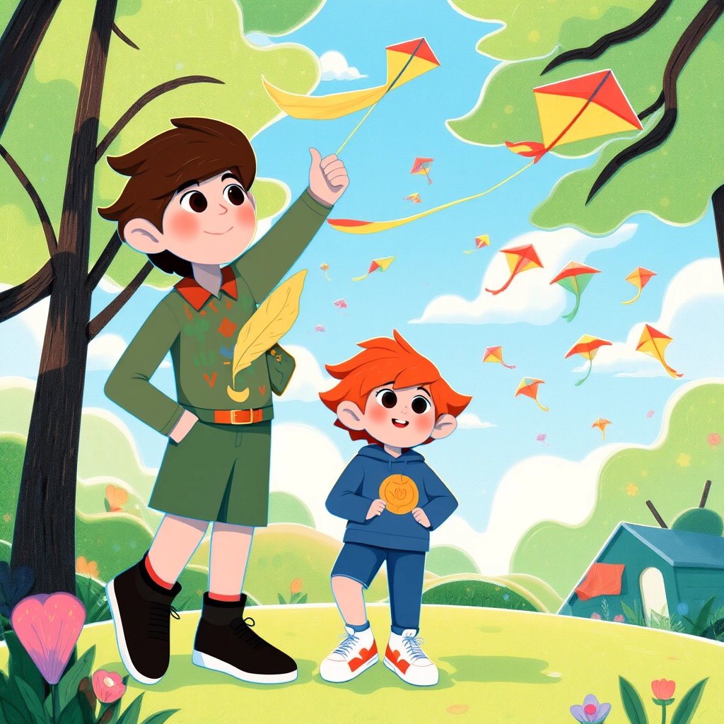 One windy day, [Jamie](SWCRNPF6) saw his friend [Max](7JNDYKGV) struggling to carry a kite. 'Don’t worry, [Max](7JNDYKGV), let me help!' [Jamie](SWCRNPF6) said, waving his golden feather for courage before rushing to his friend’s side.