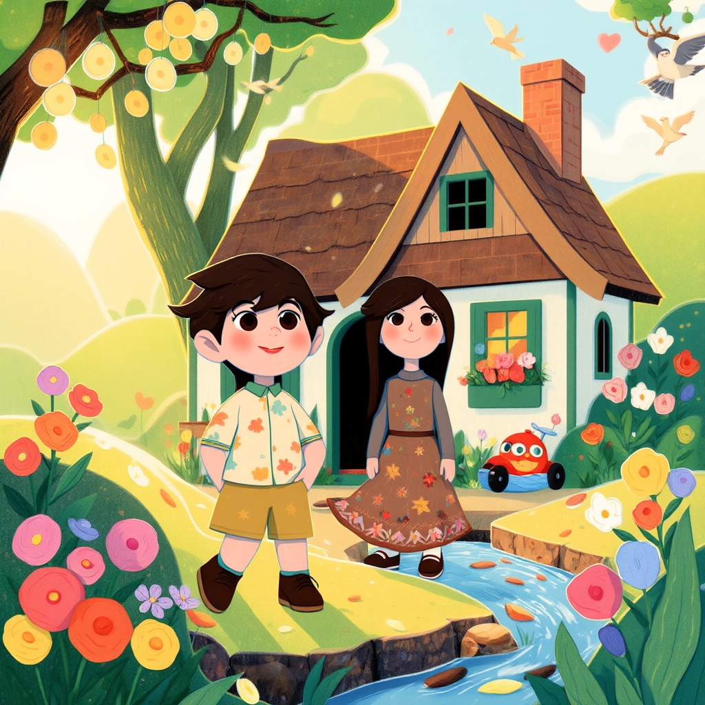 [Jamie](SWCRNPF6) and [Mia](GWWYDYCH) lived in a tiny cottage near a bubbling brook, where the birds sang every morning, and there was always an adventure waiting just outside their door.