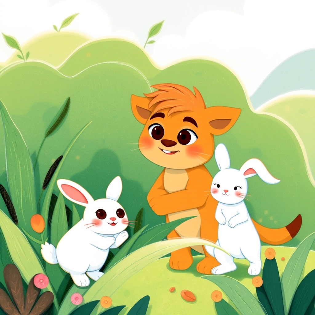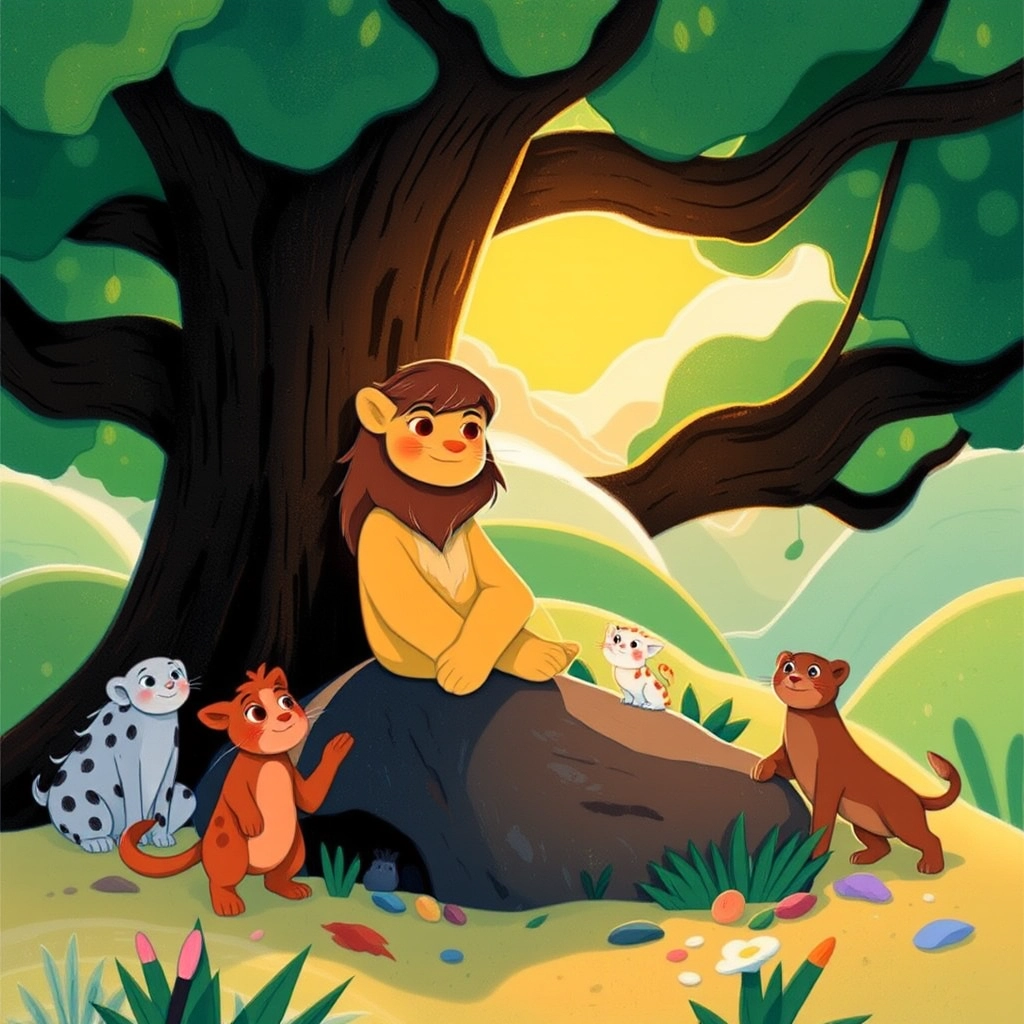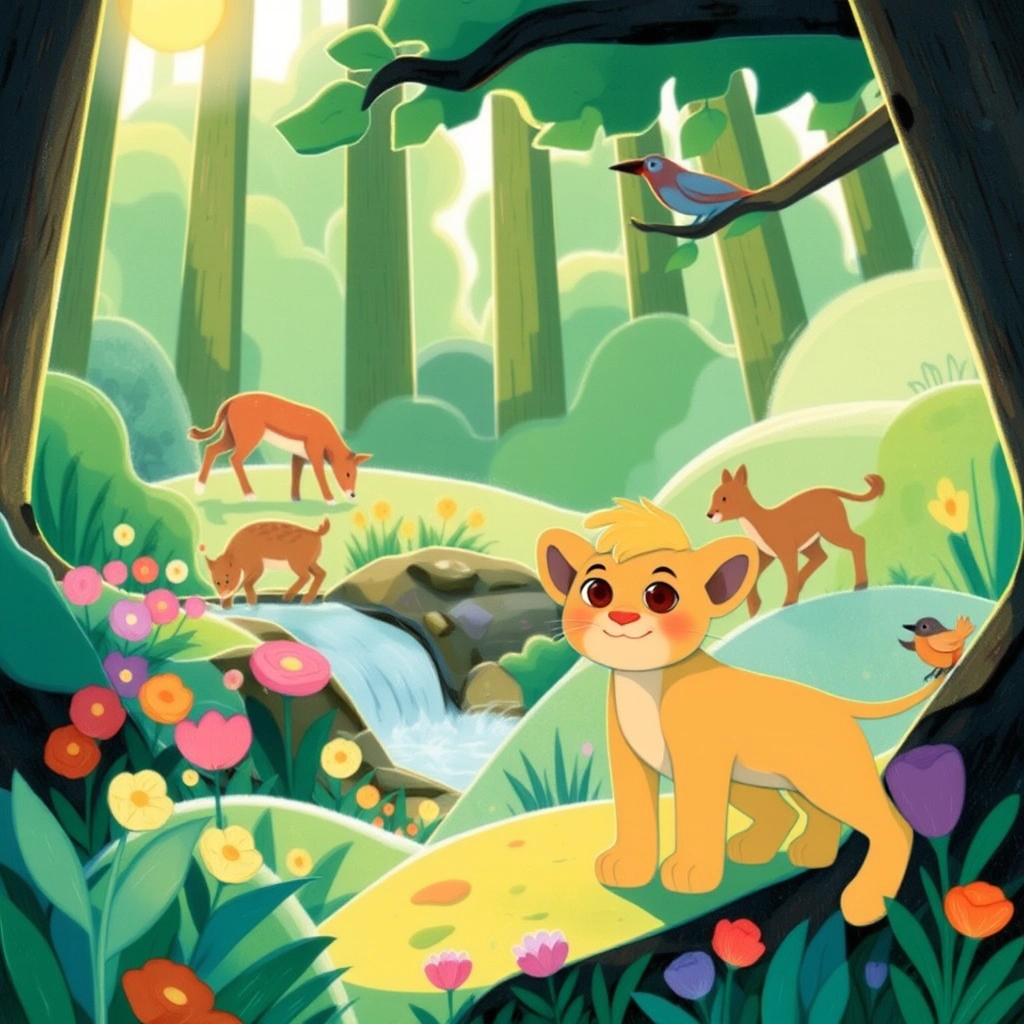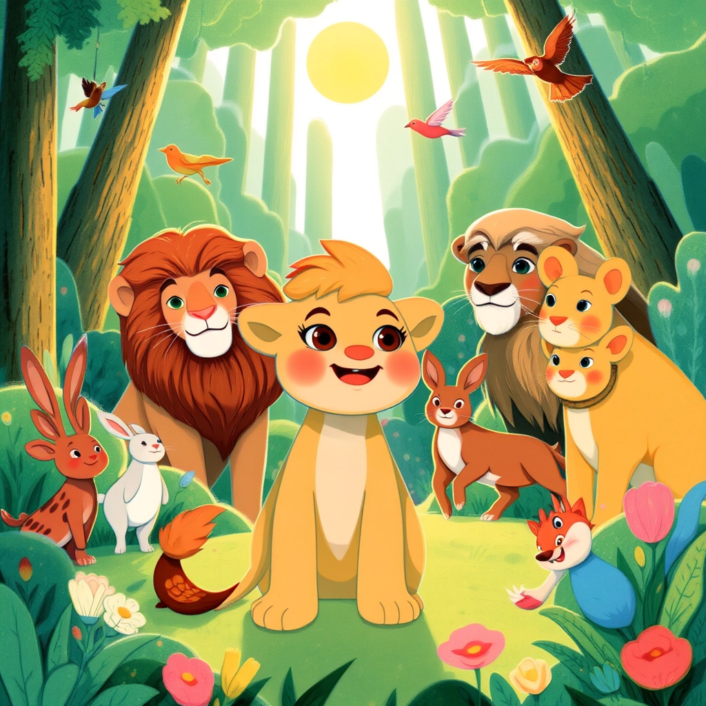 In a lush green forest, there lived a little lion named [Leo](37MNFYKG), who was small and gentle, unlike the other big and mighty lions. Despite being teased for his size, [Leo](37MNFYKG) loved to explore and make friends with the other animals.