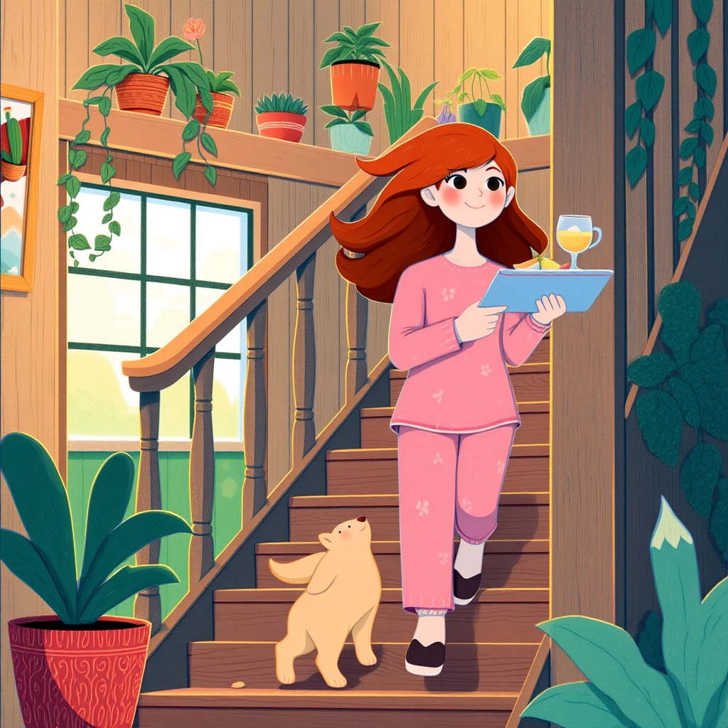 Carrying the tray carefully, [Emma](N9J7TFRP) climbed the stairs. The puppy followed excitedly, its tiny paws making soft pitter-patter sounds.