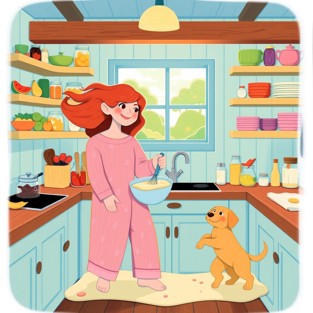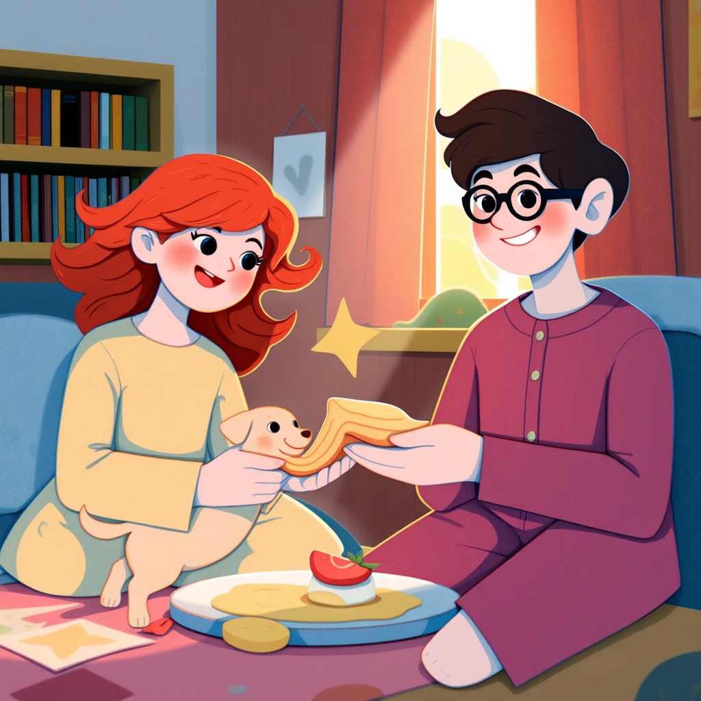 The puppy barked playfully, and [Emma](N9J7TFRP) gave it a small pancake piece. "Let’s share the happiness," she said with a chuckle.