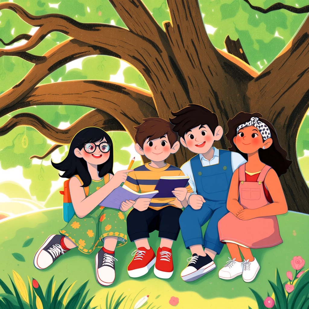 [Sophia](6FSVZF2D), [Leo](KY6WR6TK), and [Mia](R33W2LJQ) sat under the big oak tree brainstorming ideas for their summer project. "Let's do something fun and helpful," said [Sophia](6FSVZF2D), adjusting her glittery glasses.