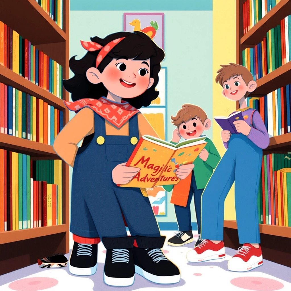 [Mia](R33W2LJQ), with her checkered bandana tied neatly around her head, exclaimed, "We can use our earnings to help the library get new books for kids!" Everyone cheered as the plan was set.
