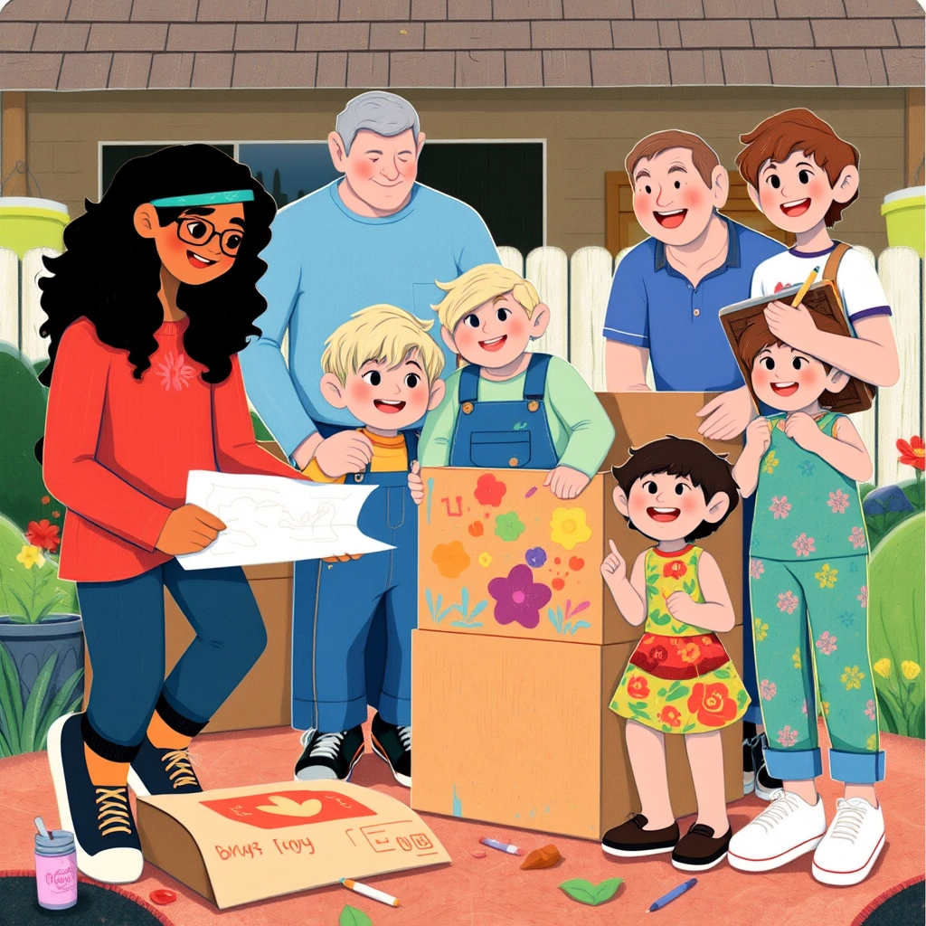 Together, they decided to build a cardboard castle! Grandpa had dropped off a pile of empty boxes just in time. [Maya](H2WTPHFV) began planning the structure, [Max](VXF29R99) was in charge of stacking, [Lily](WPDPLFTC) painted the walls, and [Rose](FMM5TRJS) came up with fun names for each room in the castle.