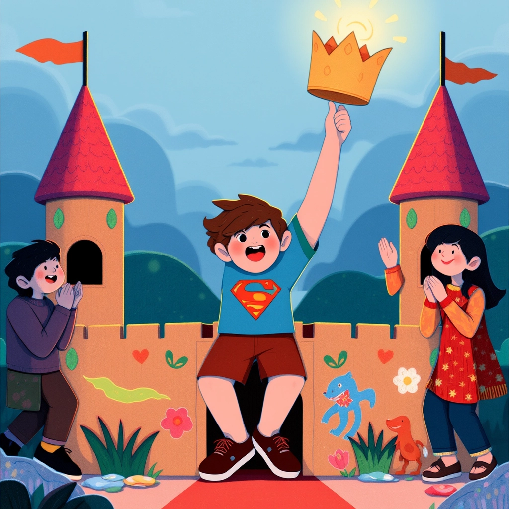 By the end of the day, the magnificent cardboard castle was complete. It had a drawbridge, towers, and even a throne inside. Everyone cheered, and [Max](VXF29R99) declared himself the King of the Castle!