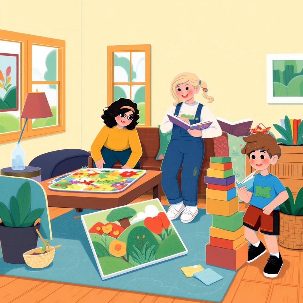 [Maya](H2WTPHFV), the eldest, loved solving puzzles, while [Lily](WPDPLFTC) was known for her love of painting, and [Rose](FMM5TRJS) for her knack for storytelling. [Max](VXF29R99), their little brother, was fascinated by building things out of blocks.