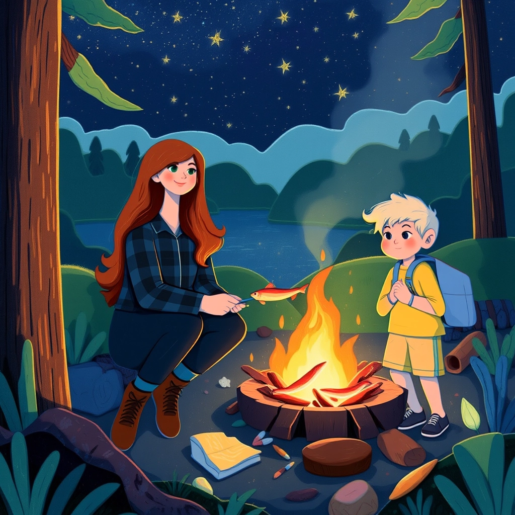 Afterward, they cooked their fish over the campfire. As the stars twinkled above, [Lily](JS34PXXV) told [Max](R2PPKHW5) stories of her childhood adventures, and they laughed under the wide open sky.