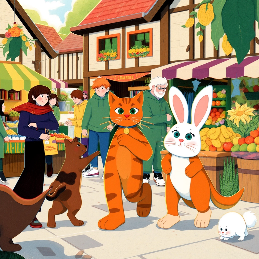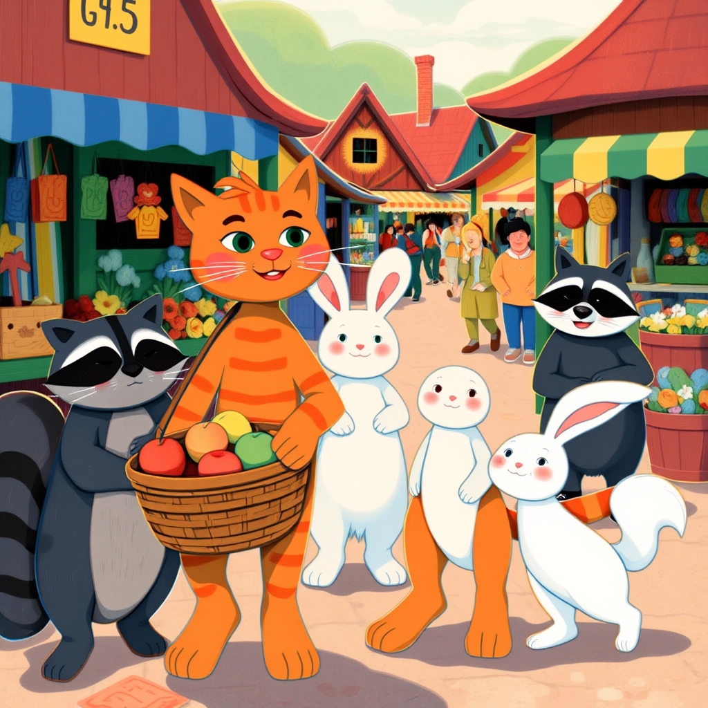 Over time, [Ginger](YL2MJT7C) started helping others at the market instead of bragging. He carried groceries for the squirrel, comforted the shy rabbit, and even complimented the raccoon’s shiny tail. Slowly, he made new friends!