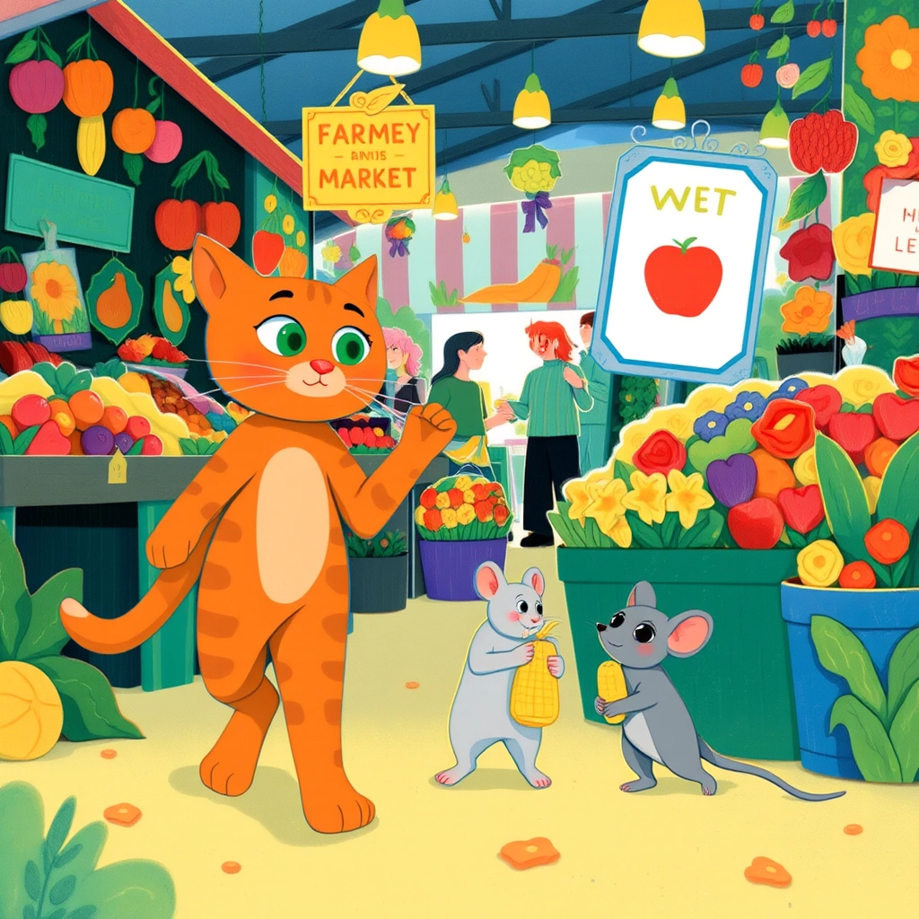 One sunny day, [Ginger](YL2MJT7C) went to the farmer's market, proudly twirling his whiskers as he walked. He was so busy bragging to a grey mouse about his shiny whiskers that he didn't notice the 'Caution: Wet Floor' sign ahead!