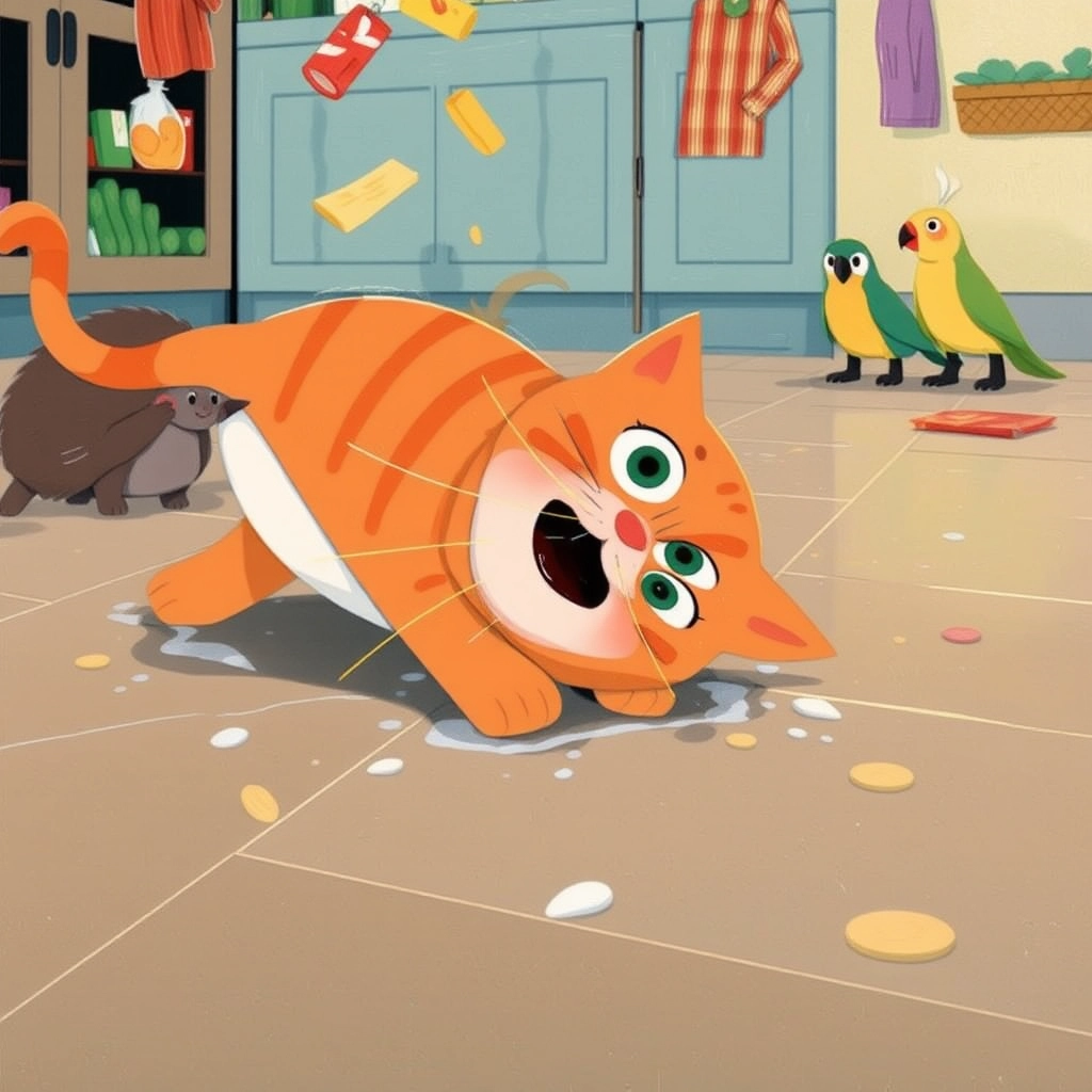 Oops! [Ginger](YL2MJT7C) slipped on the wet floor and fell with a loud THUD right on his face. When he stood up, [Ginger](YL2MJT7C) realized his beautiful whiskers were gone. His golden whiskers had fallen off!