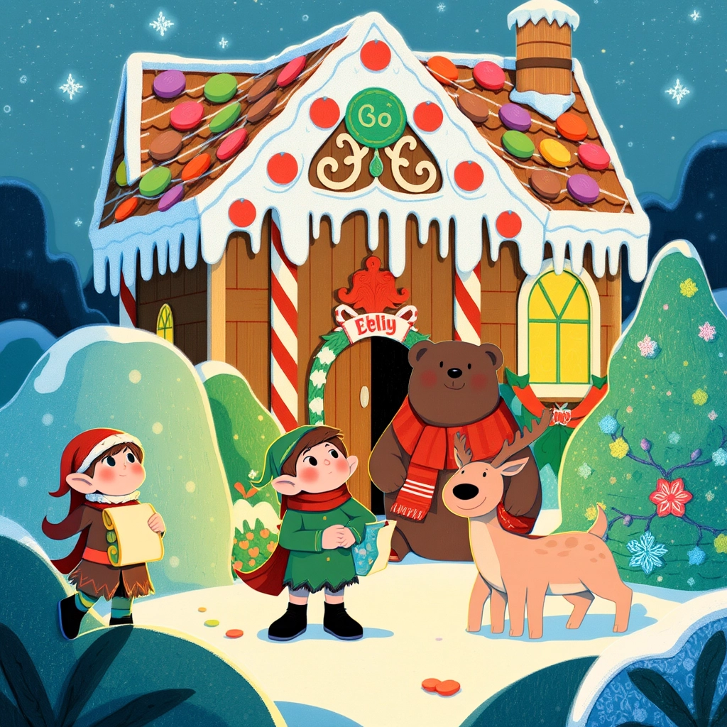 Following the clue, they climbed the sparkling hill to find a giant gingerbread house covered in candy and icing!