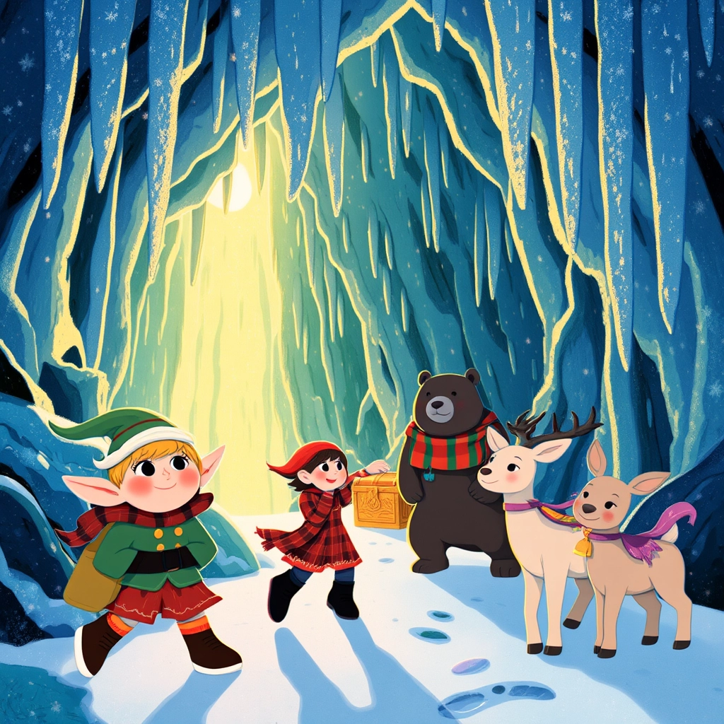 They solved the riddle! It led them to a sparkling cave of icicles, glowing with golden light.
