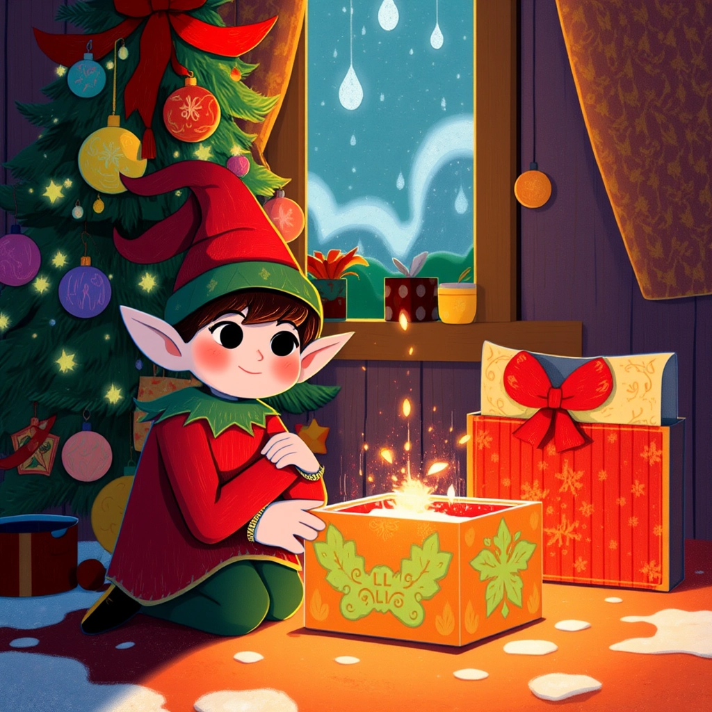 Once, on a snowy Christmas Eve, [Ellie](HBSWD2QX) the curious elf found a sparkling, glowing box hidden under the Christmas tree.