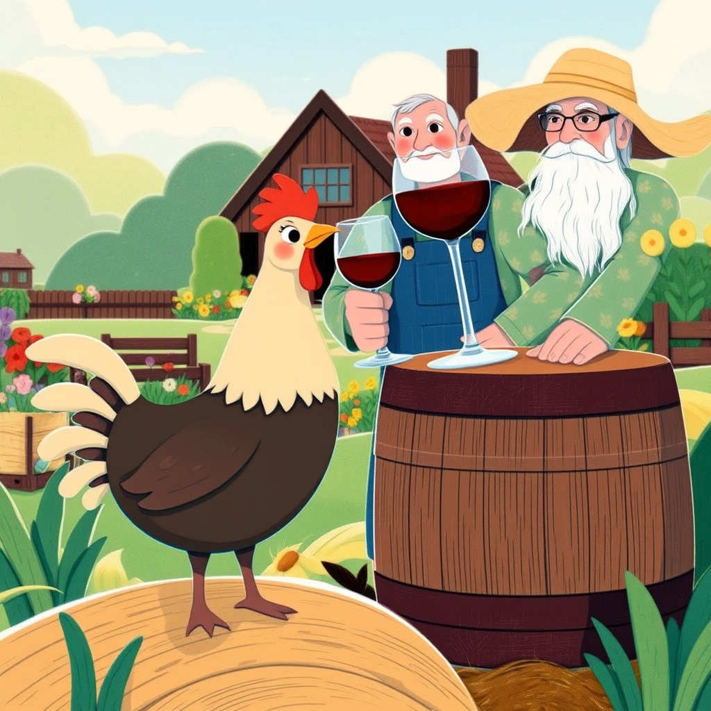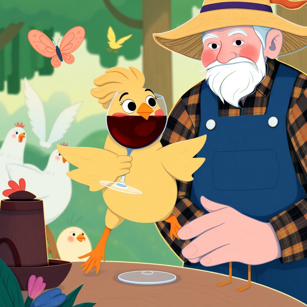 [Farmer Joe](53SR9HXH) came out and laughed, ‘[Clara](RCDTJGSM), you silly chicken! That was my wine, not juice. Let’s get you some water.’ [Farmer Joe](53SR9HXH) gently gave [Clara](RCDTJGSM) a big bowl of water to drink.