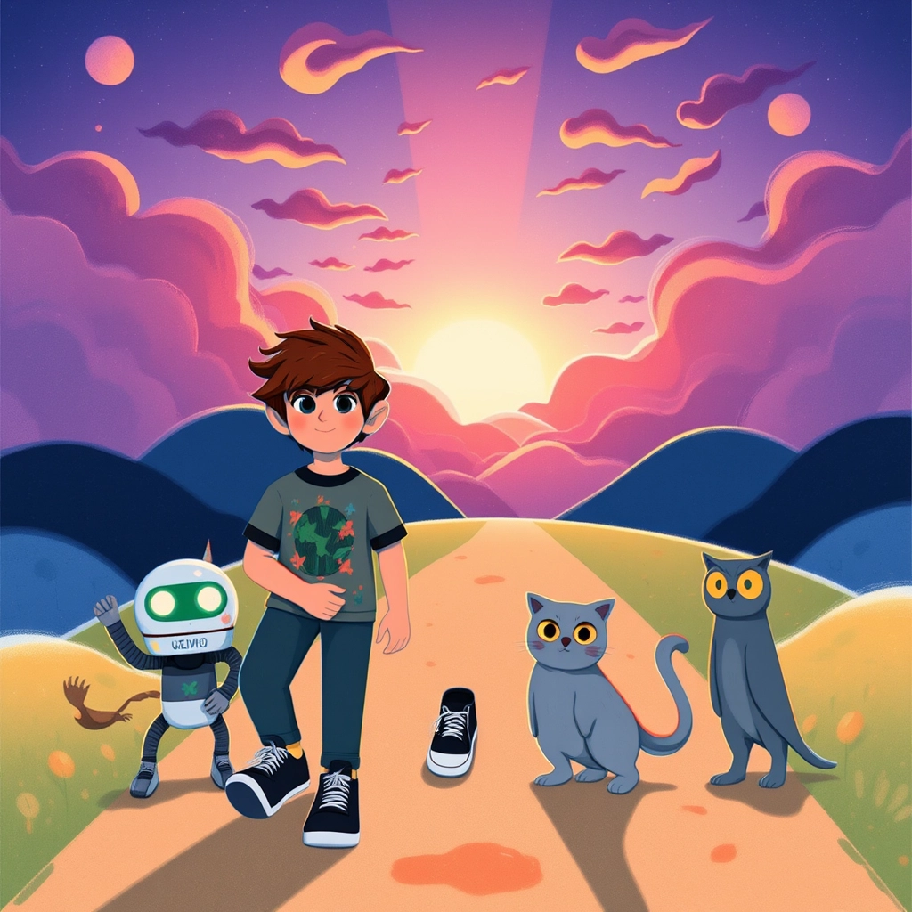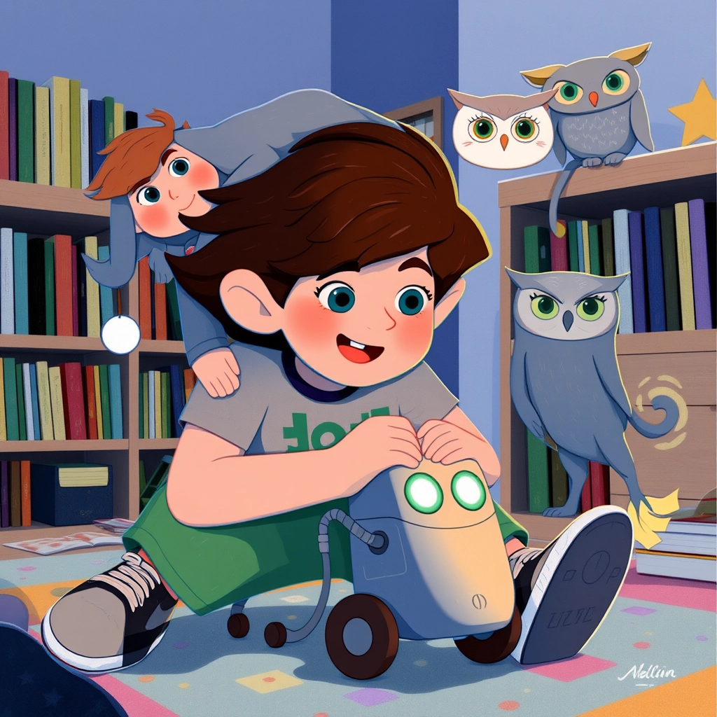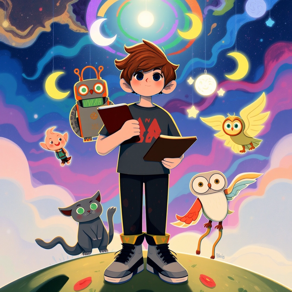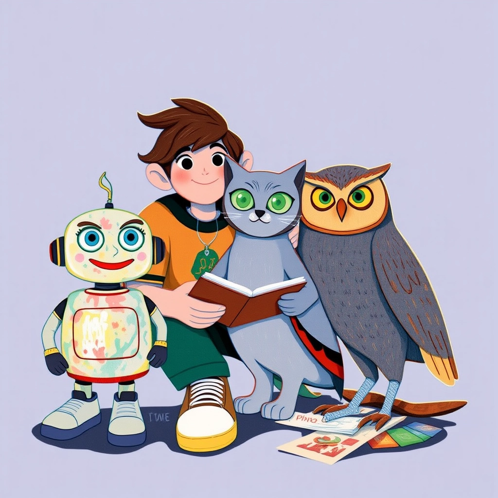 [Theo](ND96W2T5)’s favorite characters were his comic creations: a silly robot named [Gizmo](B6FMDPL2), a clever cat named [Pippa](FBC93RKH), and a wise owl called [Orin](RR5BDJQ7). They often felt so real to him, it was as if they jumped off the page to join his everyday adventures.