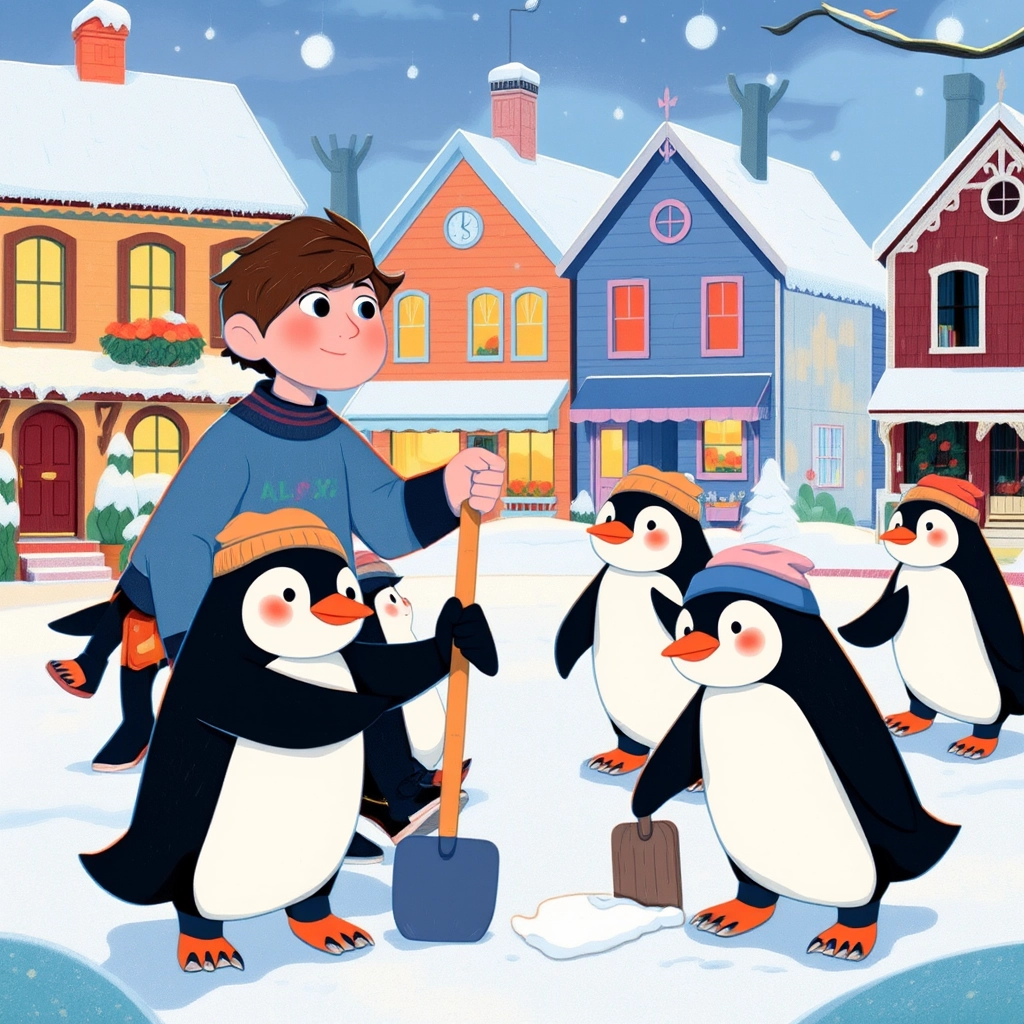 But with great power came great responsibility. [Theo](ND96W2T5) realized he could use the notebook to help others too. One snowy day, he created a team of snow-removing penguins to help clear the sidewalks for the neighborhood.