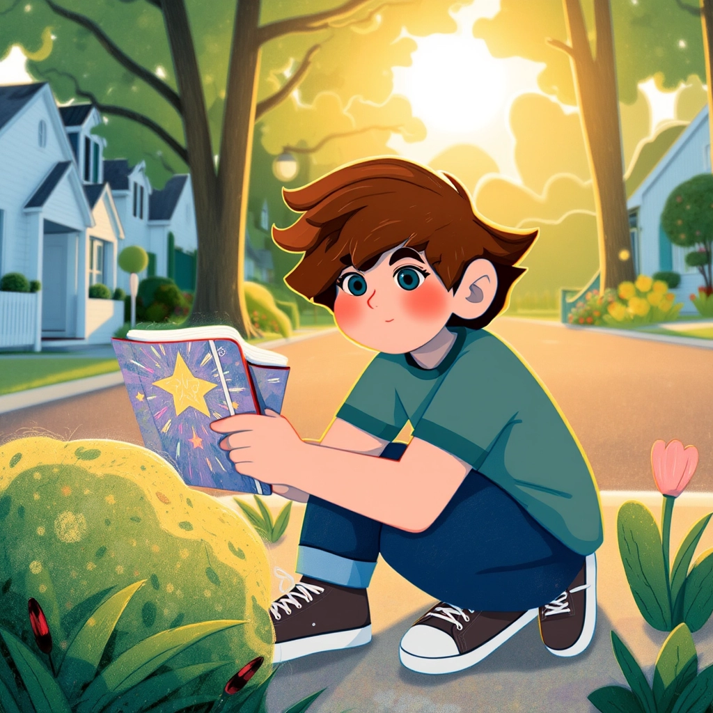 One day, while walking home, [Theo](ND96W2T5) saw something glimmer in the bushes. Curious as always, he reached in and found a mysterious silver notebook with a star on the cover. When he opened it, the pages were blank, but it felt magical!