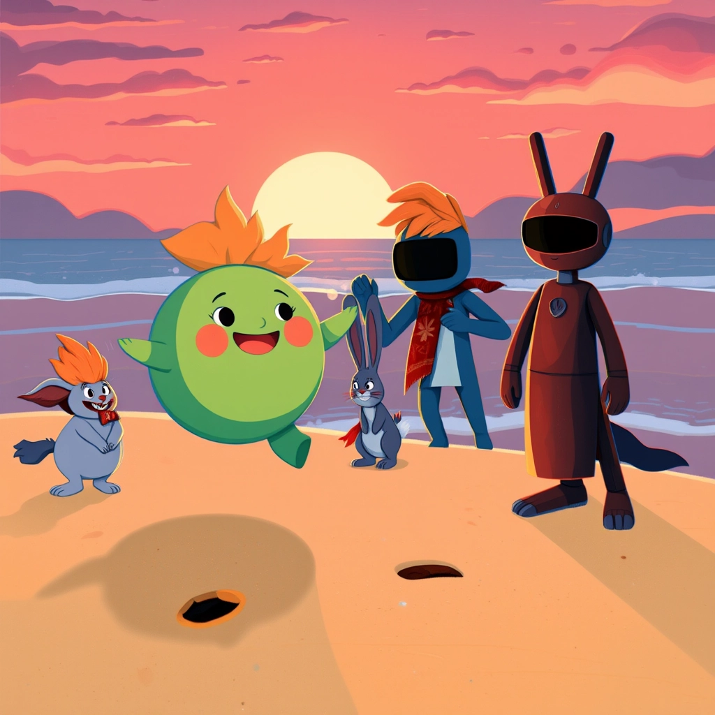 [Piney](LMQYJ75V) bounded joyfully over the soft sands of Roko Island as the morning sun rose. He turned to his friends — [Fluffo](62CZ6GP5), [BunBun](Q96Q9DVG), and the quiet [Red](SHX7T34T) — with a hopeful glint in his eye. 'Did you hear what old Grandhopper said yesterday? About the Mystery Crystals?' [Piney](LMQYJ75V) asked. [Fluffo](62CZ6GP5) scratched his orange hair thoughtfully, 'Legend says they can open a portal to another world. We’ve got to find them!'
